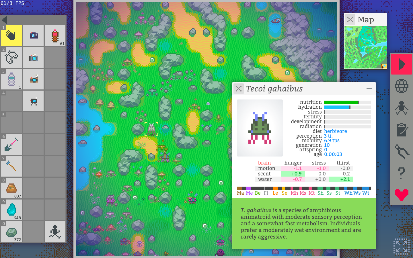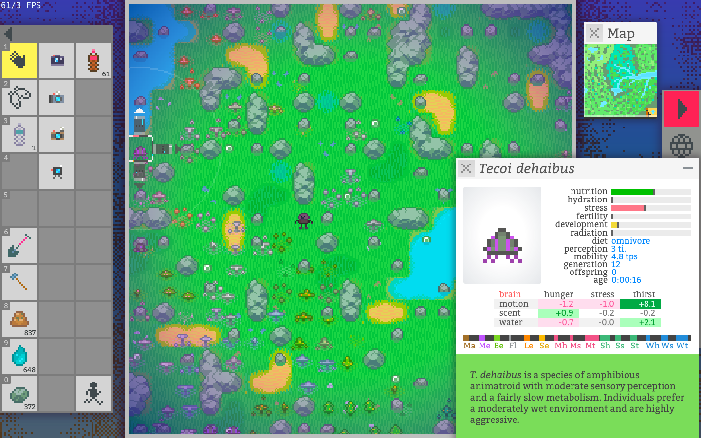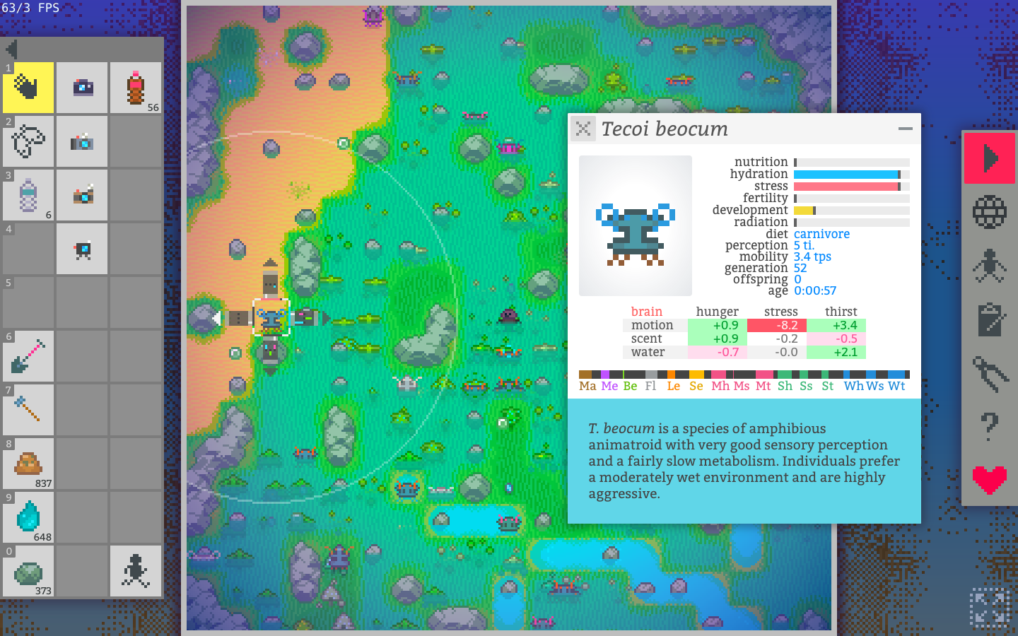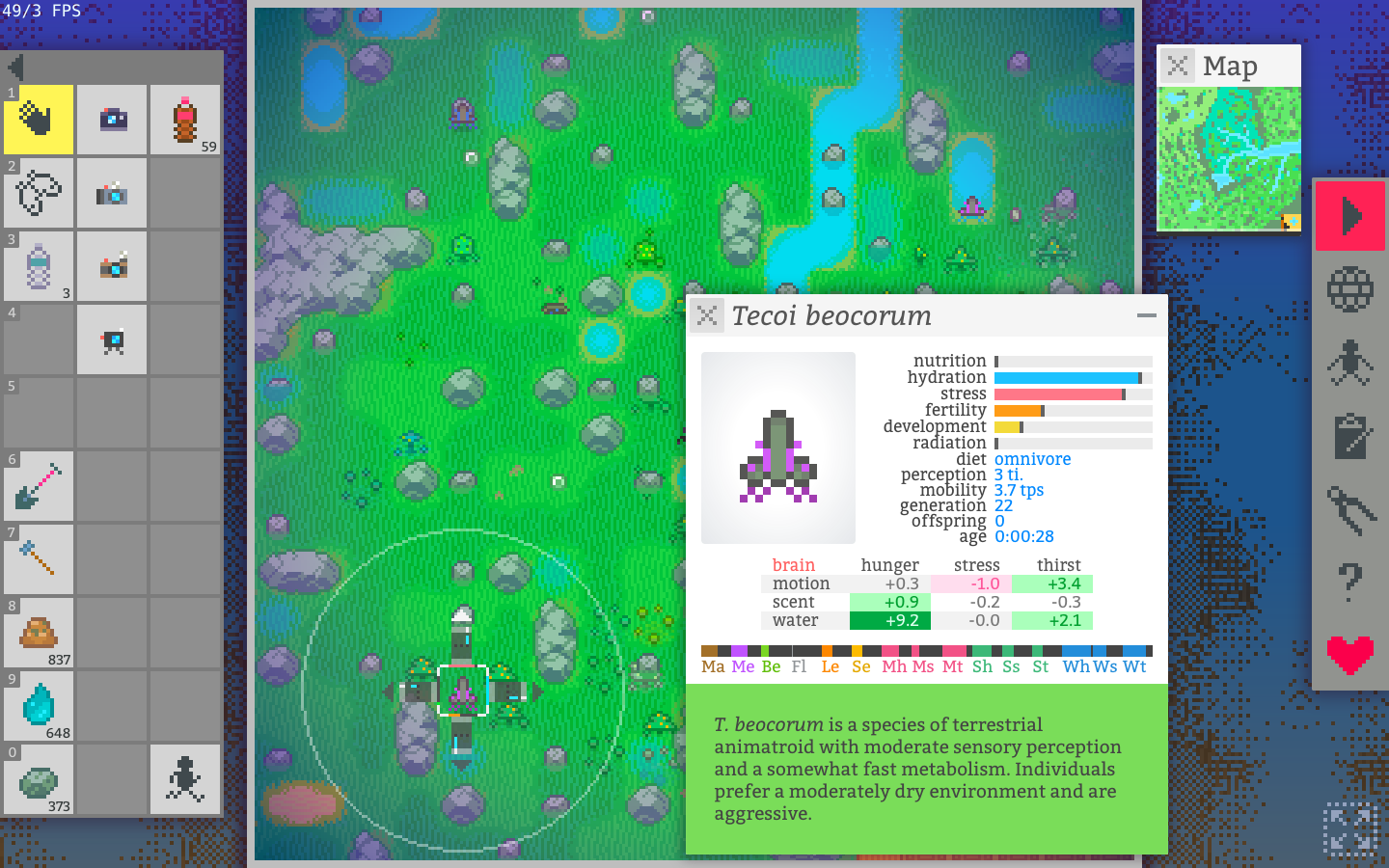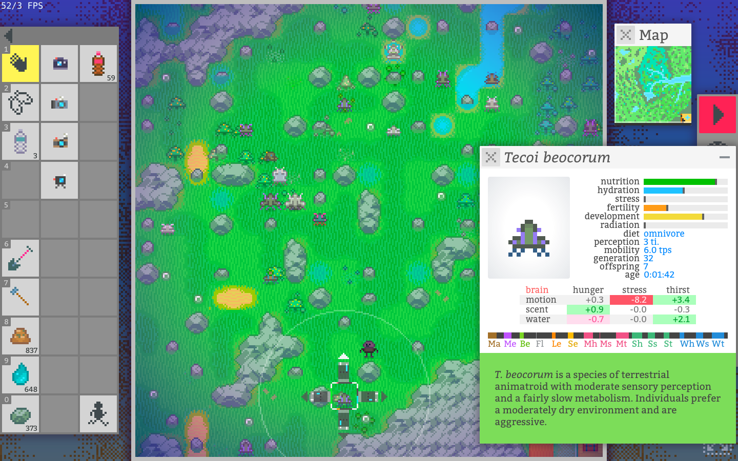 Arguably the most important item in the game is the Binoculars, which give you detailed information on any live anim you click on. Here you can see the aforementioned stats: nutrition (hunger), hydration (thirst), stress, fertility, and development (radiation is irrelevant on this map). “Diet” is a completely arbitrary distinction between herbivores, omnivores, and carnivores based on an anim’s attractions/repulsions to motion and scent, despite the fact that all anims will eat fungs, eggs, or corpses under the right conditions. Perception is the anim’s sensory perception. You might see this anim’s mobility and go “Wow! 10 tiles per second is really fast!”, but as I said earlier, this is almost entirely irrelevant due to anims only moving a single tile per metabolism tick. Generation is a nice way to see the relative age of a lineage, though other lineage-tracking tools are unfortunately lacking. Offspring is mildly interesting, counting the number of eggs this anim has laid in its lifetime. Age is very helpful, and can be used with the development bar to estimate the lifespan of an anim (for example, this anim looks like it very roughly lives to 1:30). Then, you can see the anim’s brain, and a slightly oddly-formatted readout of its genes (as adjacent bars). Hovering over a gene tells you its name— they are, from left to right, Masso (bone-related 1), Metabo (metabolism), Bendo (bone-related 2), Flexo (bone-related 3), Leggo (leg length), Senso (sensory perception), and then the brain genes, which consist of a prefix— Mo- for motion stimuli, Sce- for scent, and Wa- for water— and a suffix— -ho for hunger, -stro for stress, -tho for thirst. For example, Watho controls the attraction to water when thirsty (the bottom-right box in the brain), and Scestro controls attraction to scent when stressed (center box).