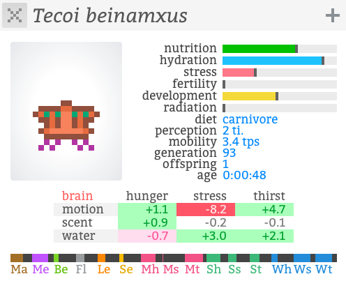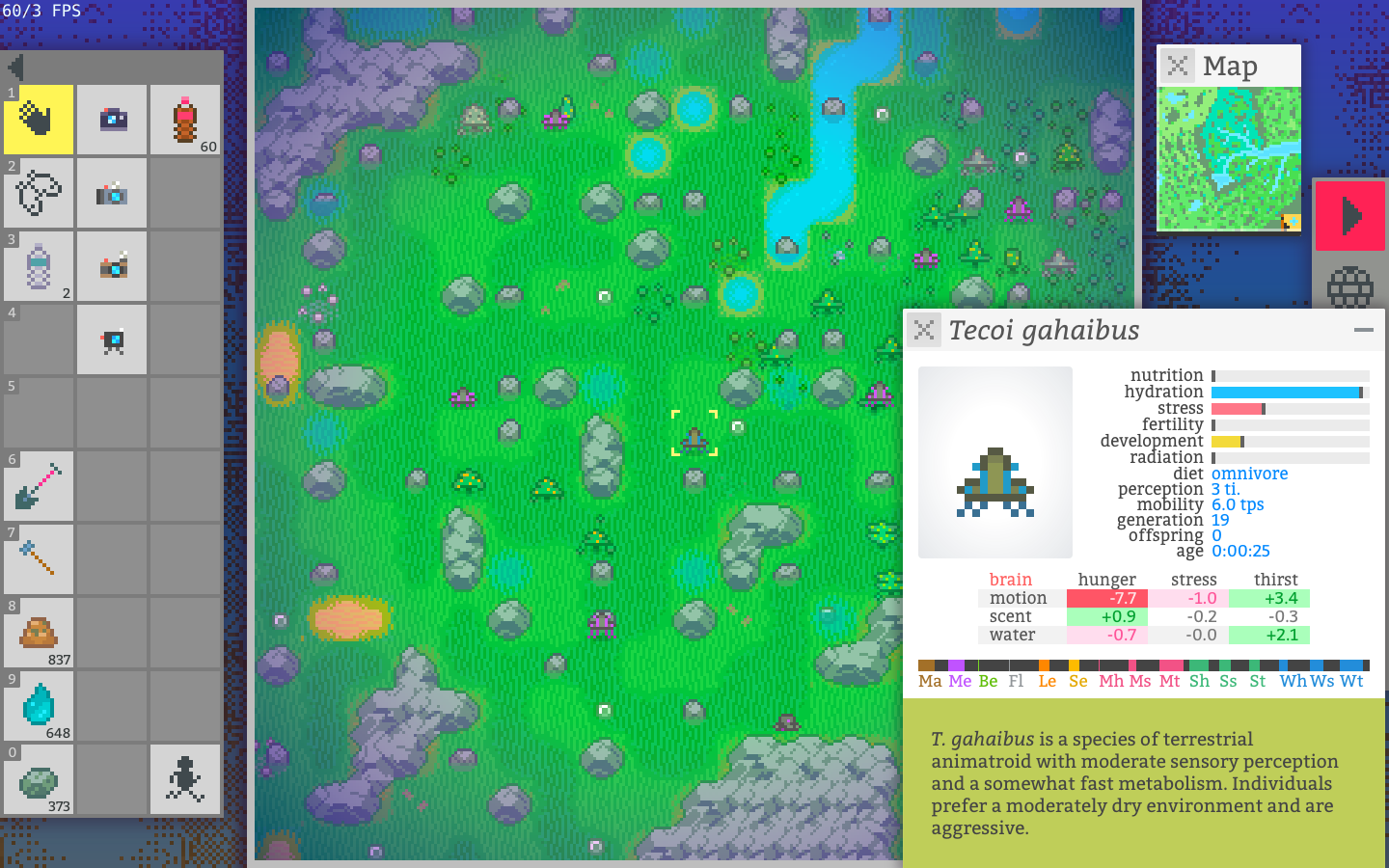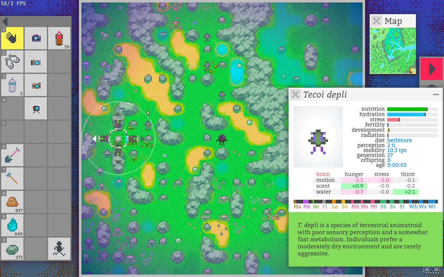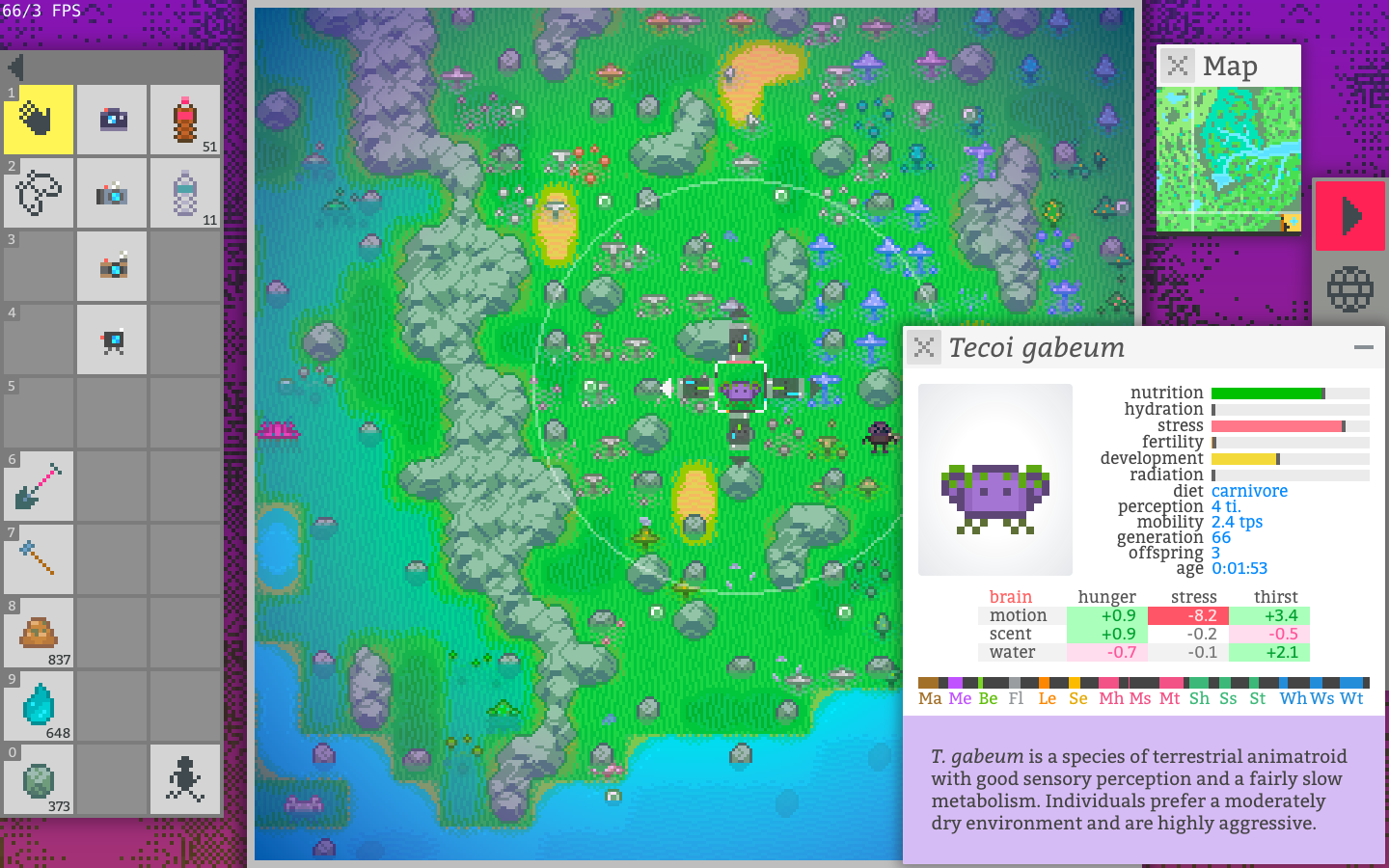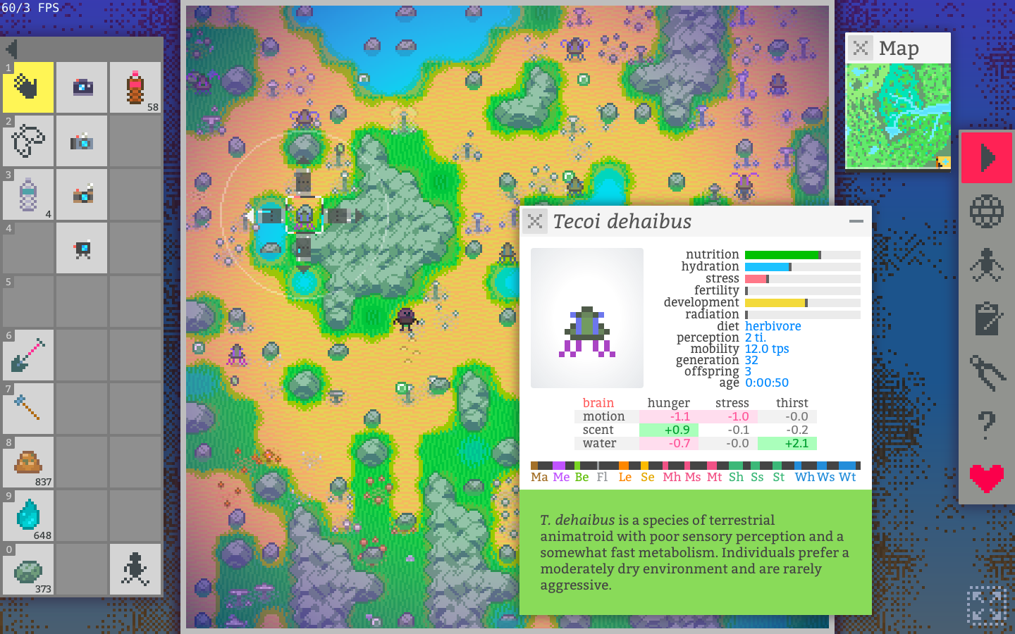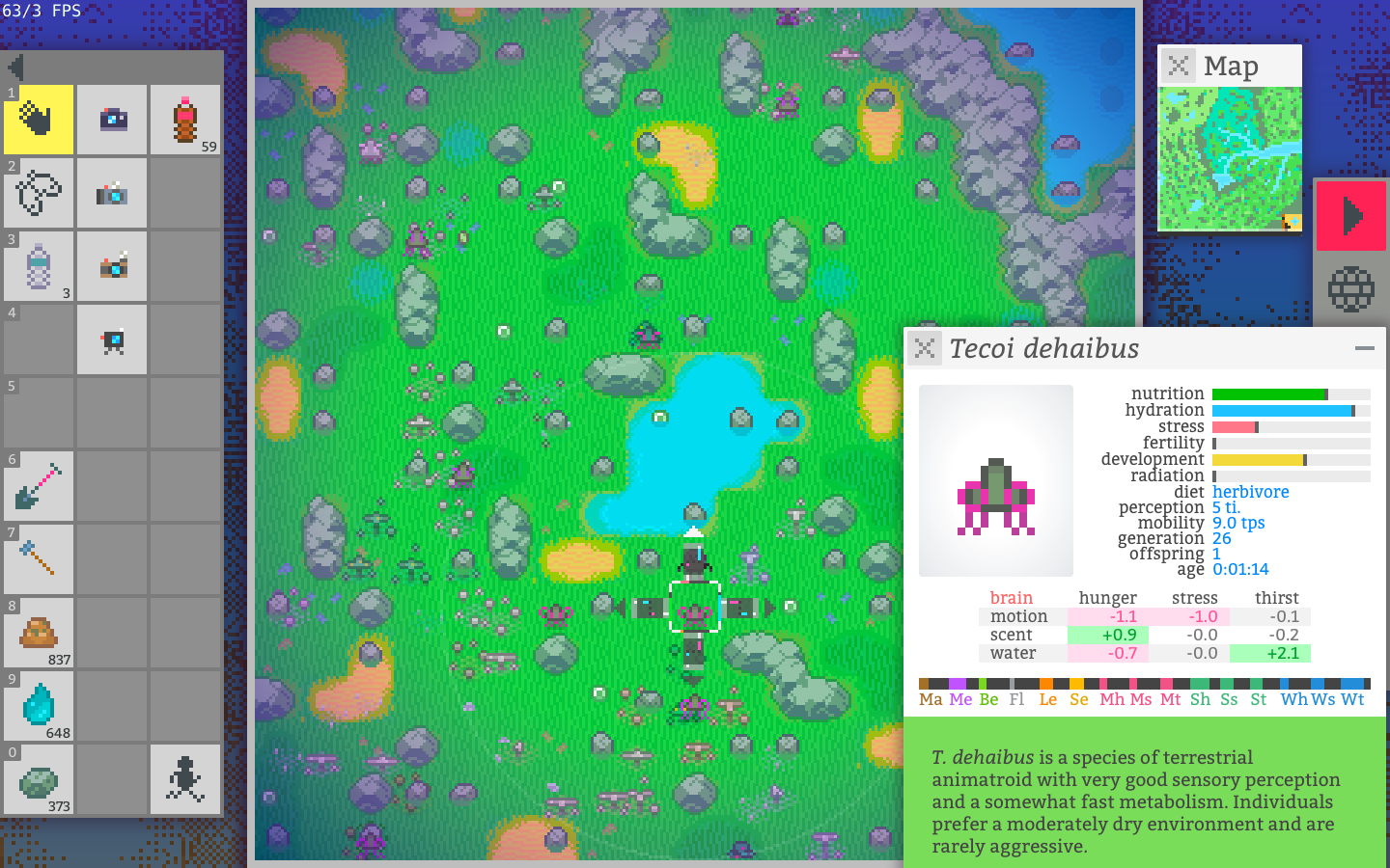 Arguably the most important item in the game is the Binoculars, which give you detailed information on any live anim you click on. Here you can see the aforementioned stats: nutrition (hunger), hydration (thirst), stress, fertility, and development (radiation is irrelevant on this map). “Diet” is a completely arbitrary distinction between herbivores, omnivores, and carnivores based on an anim’s attractions/repulsions to motion and scent, despite the fact that all anims will eat fungs, eggs, or corpses under the right conditions. Perception is the anim’s sensory perception. You might see this anim’s mobility and go “Wow! 10 tiles per second is really fast!”, but as I said earlier, this is almost entirely irrelevant due to anims only moving a single tile per metabolism tick. Generation is a nice way to see the relative age of a lineage, though other lineage-tracking tools are unfortunately lacking. Offspring is mildly interesting, counting the number of eggs this anim has laid in its lifetime. Age is very helpful, and can be used with the development bar to estimate the lifespan of an anim (for example, this anim looks like it very roughly lives to 1:30). Then, you can see the anim’s brain, and a slightly oddly-formatted readout of its genes (as adjacent bars). Hovering over a gene tells you its name— they are, from left to right, Masso (bone-related 1), Metabo (metabolism), Bendo (bone-related 2), Flexo (bone-related 3), Leggo (leg length), Senso (sensory perception), and then the brain genes, which consist of a prefix— Mo- for motion stimuli, Sce- for scent, and Wa- for water— and a suffix— -ho for hunger, -stro for stress, -tho for thirst. For example, Watho controls the attraction to water when thirsty (the bottom-right box in the brain), and Scestro controls attraction to scent when stressed (center box).
