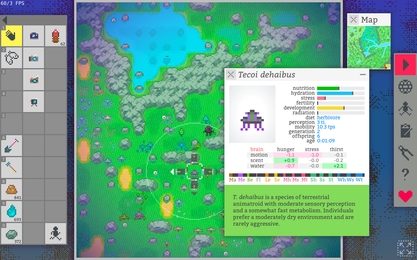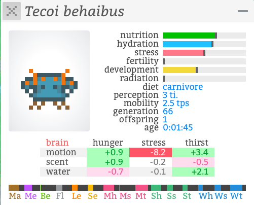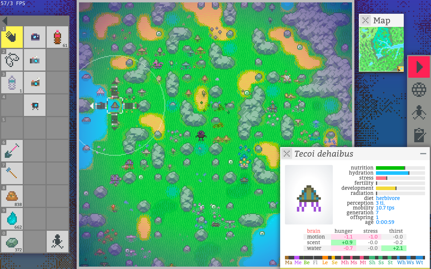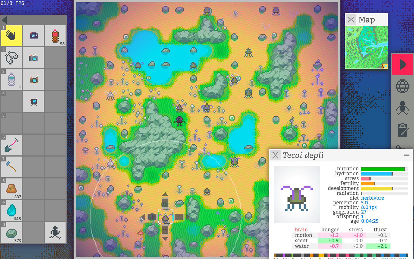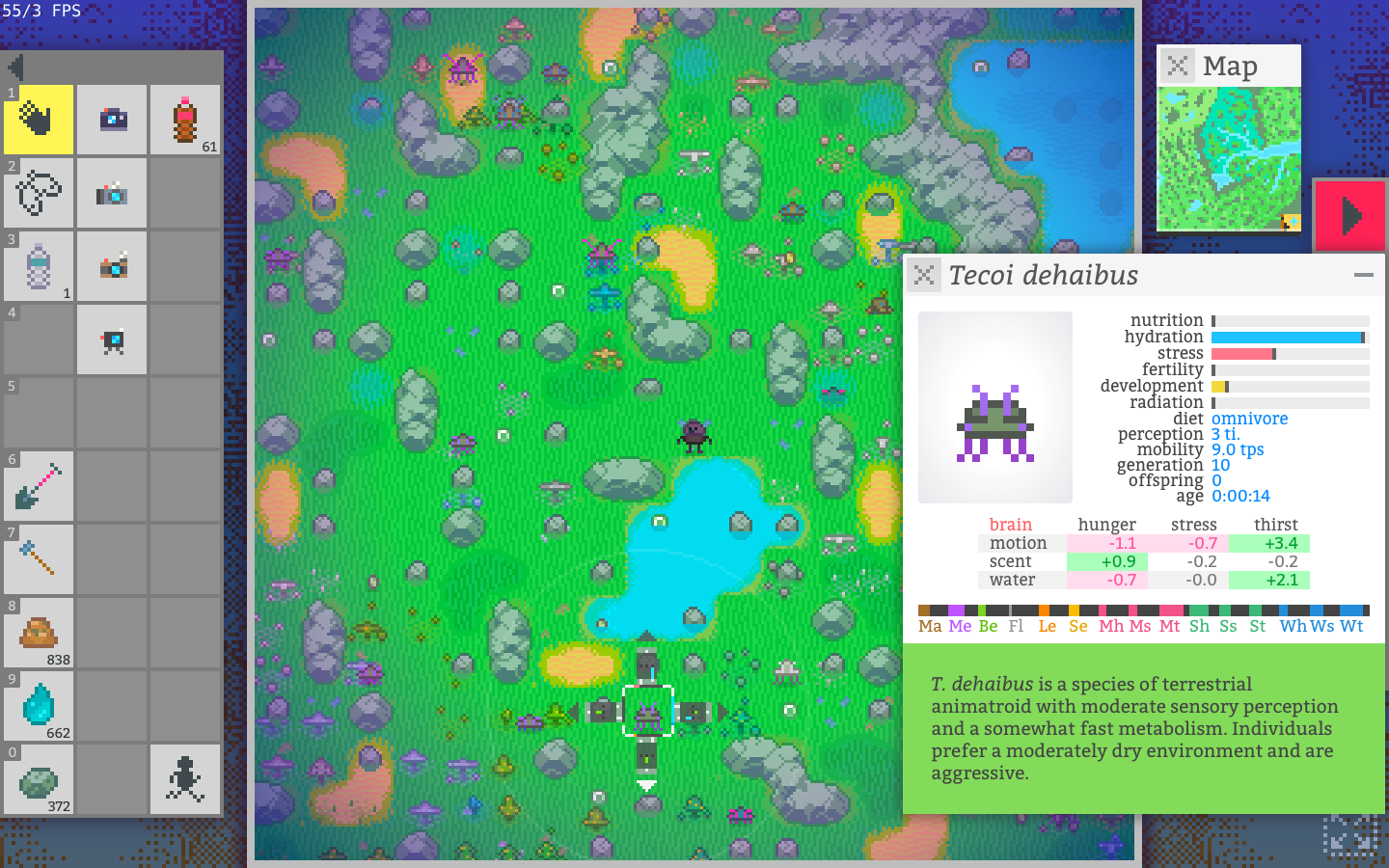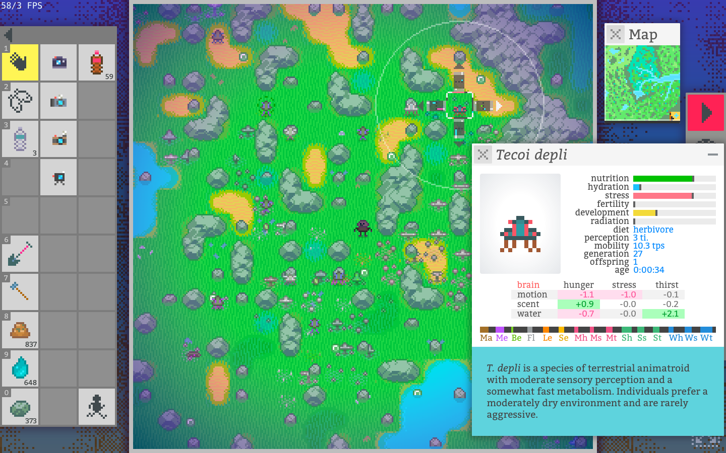 Arguably the most important item in the game is the Binoculars, which give you detailed information on any live anim you click on. Here you can see the aforementioned stats: nutrition (hunger), hydration (thirst), stress, fertility, and development (radiation is irrelevant on this map). “Diet” is a completely arbitrary distinction between herbivores, omnivores, and carnivores based on an anim’s attractions/repulsions to motion and scent, despite the fact that all anims will eat fungs, eggs, or corpses under the right conditions. Perception is the anim’s sensory perception. You might see this anim’s mobility and go “Wow! 10 tiles per second is really fast!”, but as I said earlier, this is almost entirely irrelevant due to anims only moving a single tile per metabolism tick. Generation is a nice way to see the relative age of a lineage, though other lineage-tracking tools are unfortunately lacking. Offspring is mildly interesting, counting the number of eggs this anim has laid in its lifetime. Age is very helpful, and can be used with the development bar to estimate the lifespan of an anim (for example, this anim looks like it very roughly lives to 1:30). Then, you can see the anim’s brain, and a slightly oddly-formatted readout of its genes (as adjacent bars). Hovering over a gene tells you its name— they are, from left to right, Masso (bone-related 1), Metabo (metabolism), Bendo (bone-related 2), Flexo (bone-related 3), Leggo (leg length), Senso (sensory perception), and then the brain genes, which consist of a prefix— Mo- for motion stimuli, Sce- for scent, and Wa- for water— and a suffix— -ho for hunger, -stro for stress, -tho for thirst. For example, Watho controls the attraction to water when thirsty (the bottom-right box in the brain), and Scestro controls attraction to scent when stressed (center box).