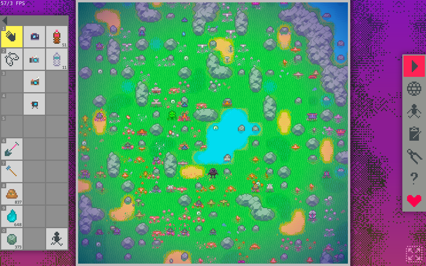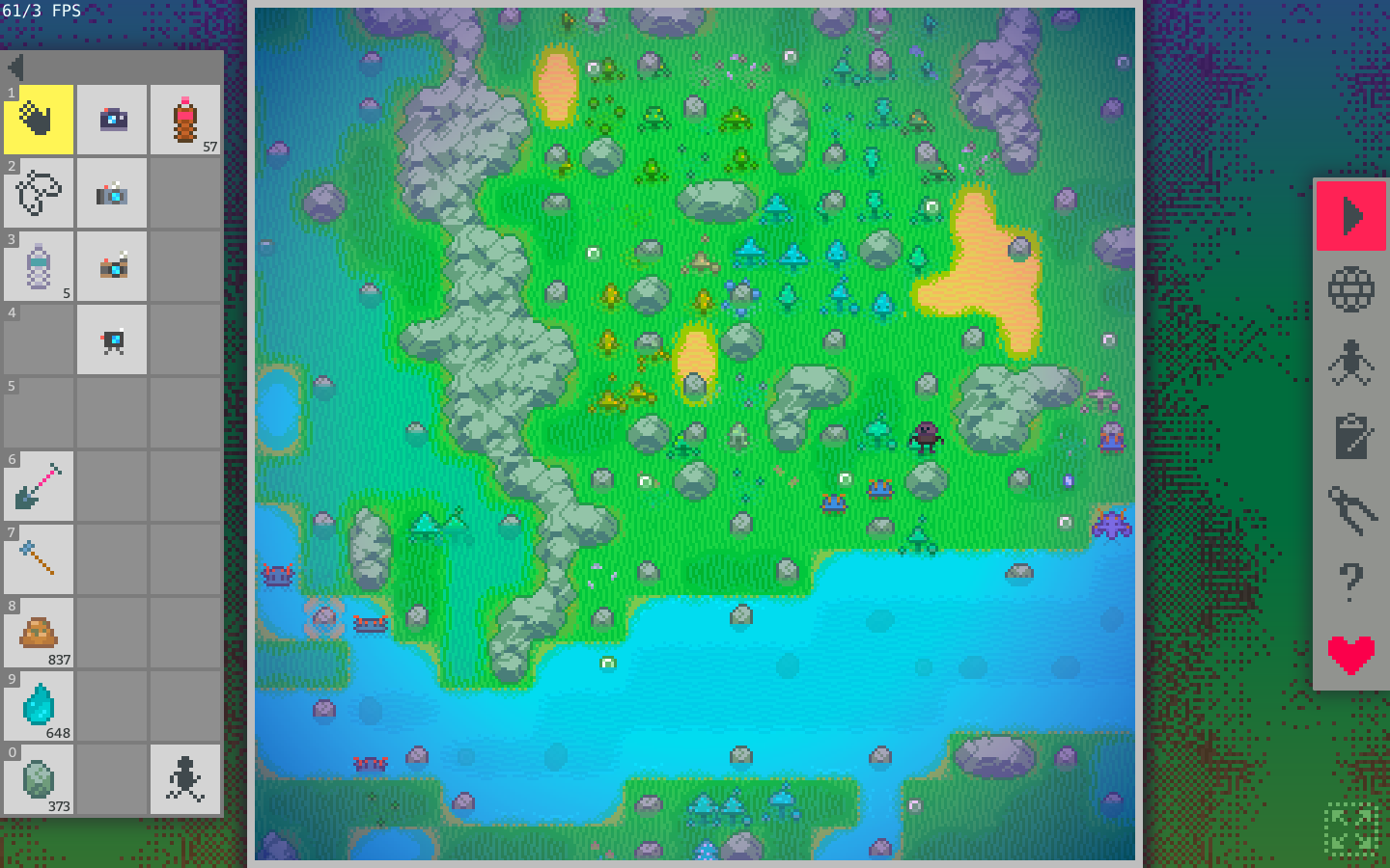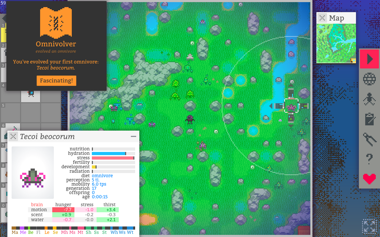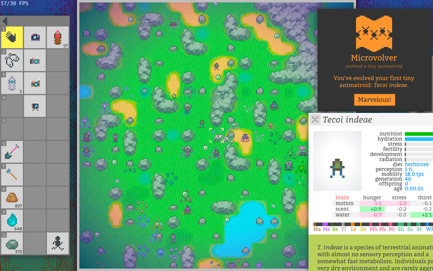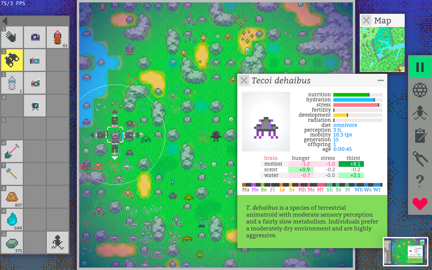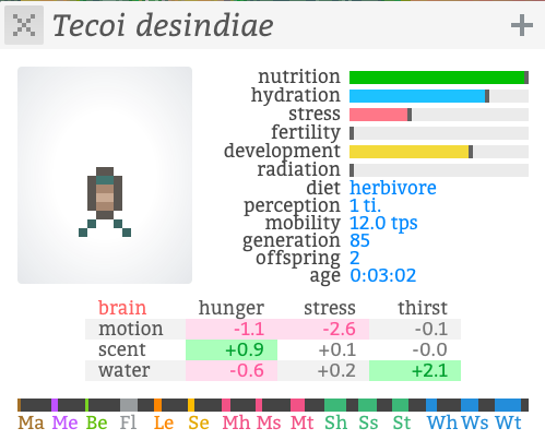 Arguably the most important item in the game is the Binoculars, which give you detailed information on any live anim you click on. Here you can see the aforementioned stats: nutrition (hunger), hydration (thirst), stress, fertility, and development (radiation is irrelevant on this map). “Diet” is a completely arbitrary distinction between herbivores, omnivores, and carnivores based on an anim’s attractions/repulsions to motion and scent, despite the fact that all anims will eat fungs, eggs, or corpses under the right conditions. Perception is the anim’s sensory perception. You might see this anim’s mobility and go “Wow! 10 tiles per second is really fast!”, but as I said earlier, this is almost entirely irrelevant due to anims only moving a single tile per metabolism tick. Generation is a nice way to see the relative age of a lineage, though other lineage-tracking tools are unfortunately lacking. Offspring is mildly interesting, counting the number of eggs this anim has laid in its lifetime. Age is very helpful, and can be used with the development bar to estimate the lifespan of an anim (for example, this anim looks like it very roughly lives to 1:30). Then, you can see the anim’s brain, and a slightly oddly-formatted readout of its genes (as adjacent bars). Hovering over a gene tells you its name— they are, from left to right, Masso (bone-related 1), Metabo (metabolism), Bendo (bone-related 2), Flexo (bone-related 3), Leggo (leg length), Senso (sensory perception), and then the brain genes, which consist of a prefix— Mo- for motion stimuli, Sce- for scent, and Wa- for water— and a suffix— -ho for hunger, -stro for stress, -tho for thirst. For example, Watho controls the attraction to water when thirsty (the bottom-right box in the brain), and Scestro controls attraction to scent when stressed (center box).