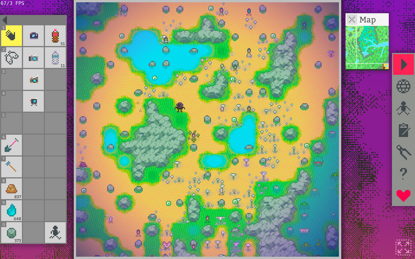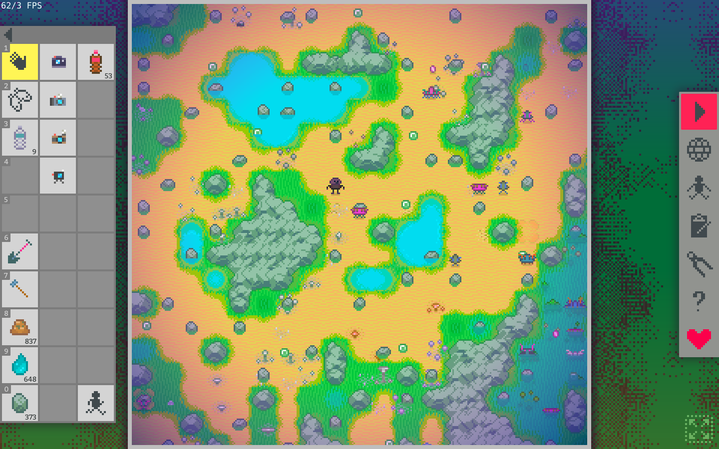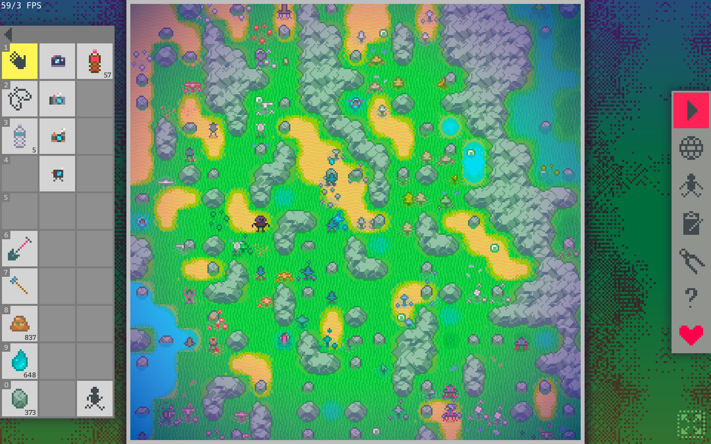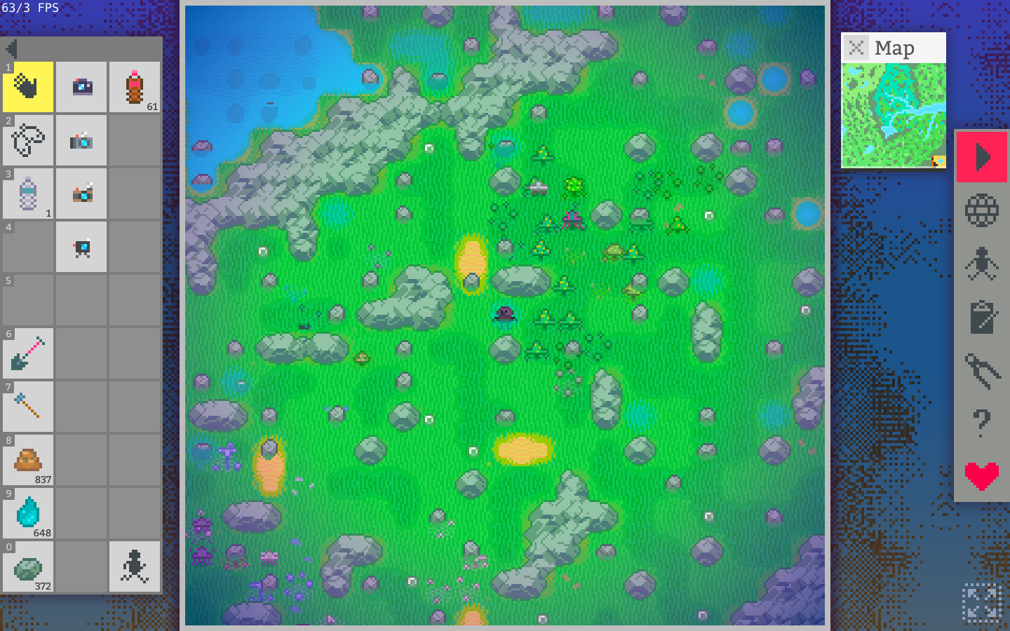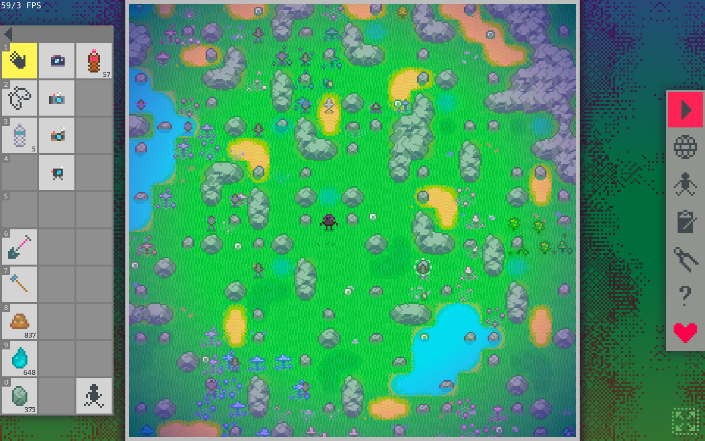 Arguably the most important item in the game is the Binoculars, which give you detailed information on any live anim you click on. Here you can see the aforementioned stats: nutrition (hunger), hydration (thirst), stress, fertility, and development (radiation is irrelevant on this map). “Diet” is a completely arbitrary distinction between herbivores, omnivores, and carnivores based on an anim’s attractions/repulsions to motion and scent, despite the fact that all anims will eat fungs, eggs, or corpses under the right conditions. Perception is the anim’s sensory perception. You might see this anim’s mobility and go “Wow! 10 tiles per second is really fast!”, but as I said earlier, this is almost entirely irrelevant due to anims only moving a single tile per metabolism tick. Generation is a nice way to see the relative age of a lineage, though other lineage-tracking tools are unfortunately lacking. Offspring is mildly interesting, counting the number of eggs this anim has laid in its lifetime. Age is very helpful, and can be used with the development bar to estimate the lifespan of an anim (for example, this anim looks like it very roughly lives to 1:30). Then, you can see the anim’s brain, and a slightly oddly-formatted readout of its genes (as adjacent bars). Hovering over a gene tells you its name— they are, from left to right, Masso (bone-related 1), Metabo (metabolism), Bendo (bone-related 2), Flexo (bone-related 3), Leggo (leg length), Senso (sensory perception), and then the brain genes, which consist of a prefix— Mo- for motion stimuli, Sce- for scent, and Wa- for water— and a suffix— -ho for hunger, -stro for stress, -tho for thirst. For example, Watho controls the attraction to water when thirsty (the bottom-right box in the brain), and Scestro controls attraction to scent when stressed (center box).