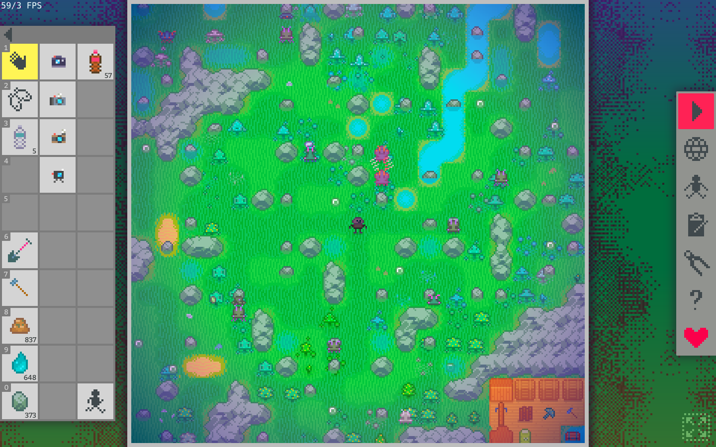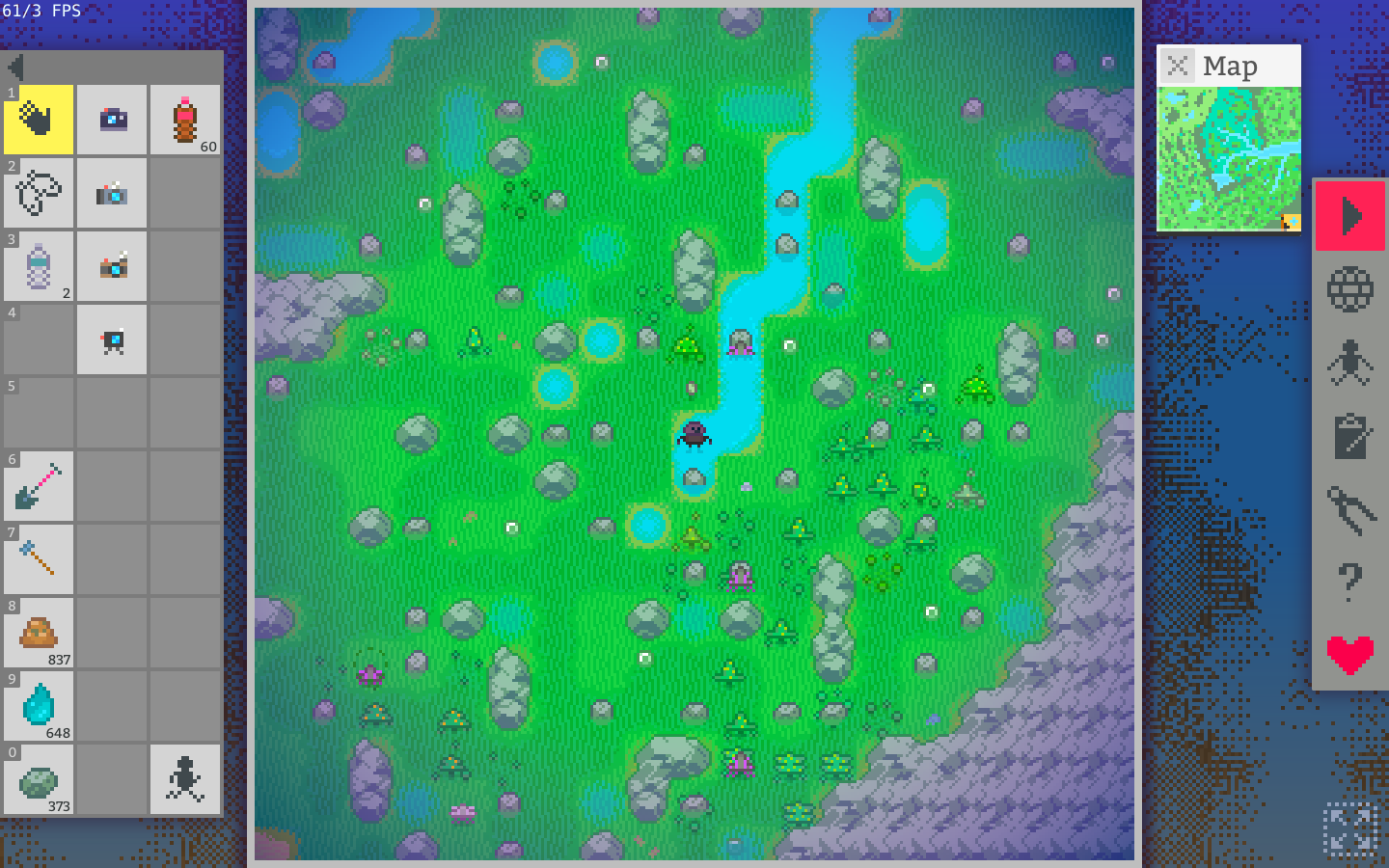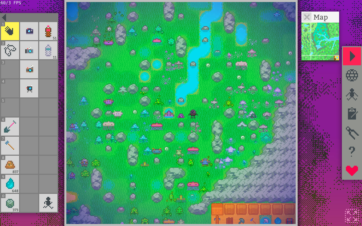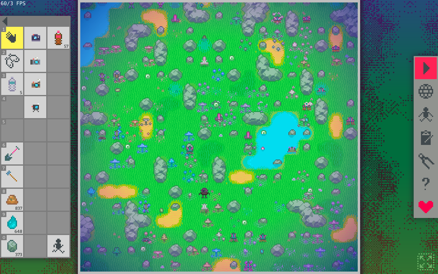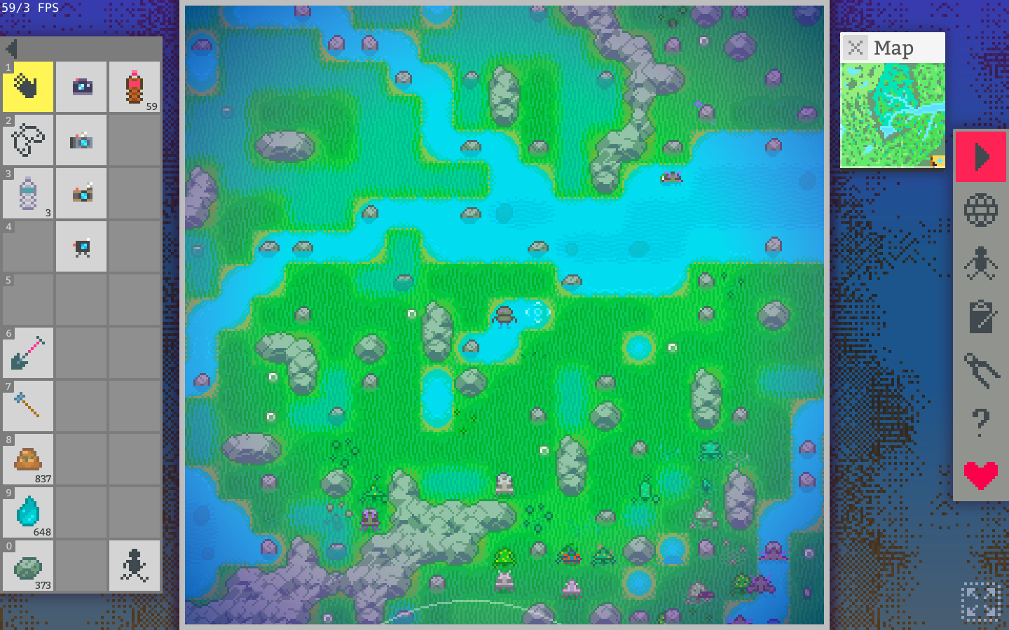 Arguably the most important item in the game is the Binoculars, which give you detailed information on any live anim you click on. Here you can see the aforementioned stats: nutrition (hunger), hydration (thirst), stress, fertility, and development (radiation is irrelevant on this map). “Diet” is a completely arbitrary distinction between herbivores, omnivores, and carnivores based on an anim’s attractions/repulsions to motion and scent, despite the fact that all anims will eat fungs, eggs, or corpses under the right conditions. Perception is the anim’s sensory perception. You might see this anim’s mobility and go “Wow! 10 tiles per second is really fast!”, but as I said earlier, this is almost entirely irrelevant due to anims only moving a single tile per metabolism tick. Generation is a nice way to see the relative age of a lineage, though other lineage-tracking tools are unfortunately lacking. Offspring is mildly interesting, counting the number of eggs this anim has laid in its lifetime. Age is very helpful, and can be used with the development bar to estimate the lifespan of an anim (for example, this anim looks like it very roughly lives to 1:30). Then, you can see the anim’s brain, and a slightly oddly-formatted readout of its genes (as adjacent bars). Hovering over a gene tells you its name— they are, from left to right, Masso (bone-related 1), Metabo (metabolism), Bendo (bone-related 2), Flexo (bone-related 3), Leggo (leg length), Senso (sensory perception), and then the brain genes, which consist of a prefix— Mo- for motion stimuli, Sce- for scent, and Wa- for water— and a suffix— -ho for hunger, -stro for stress, -tho for thirst. For example, Watho controls the attraction to water when thirsty (the bottom-right box in the brain), and Scestro controls attraction to scent when stressed (center box).