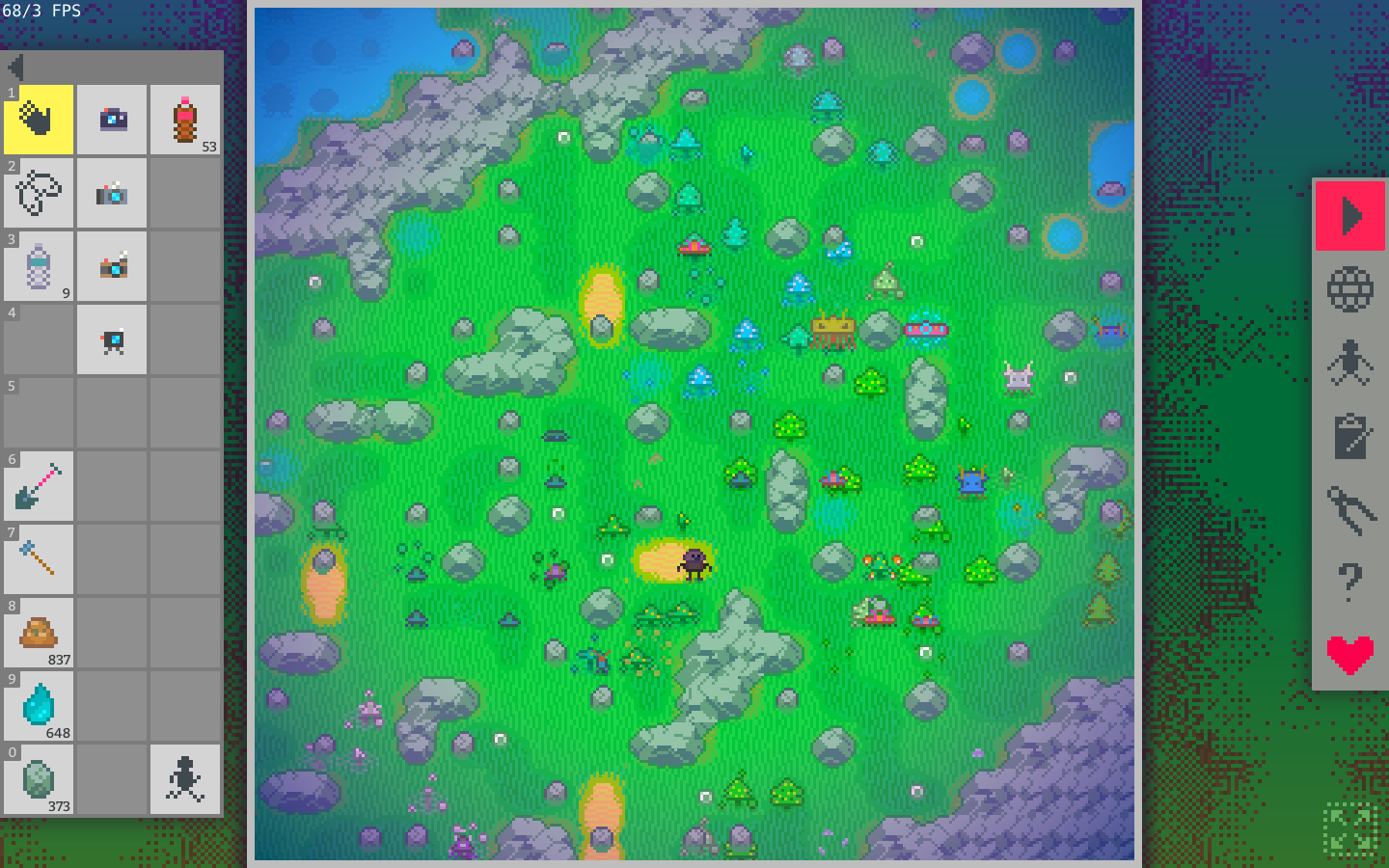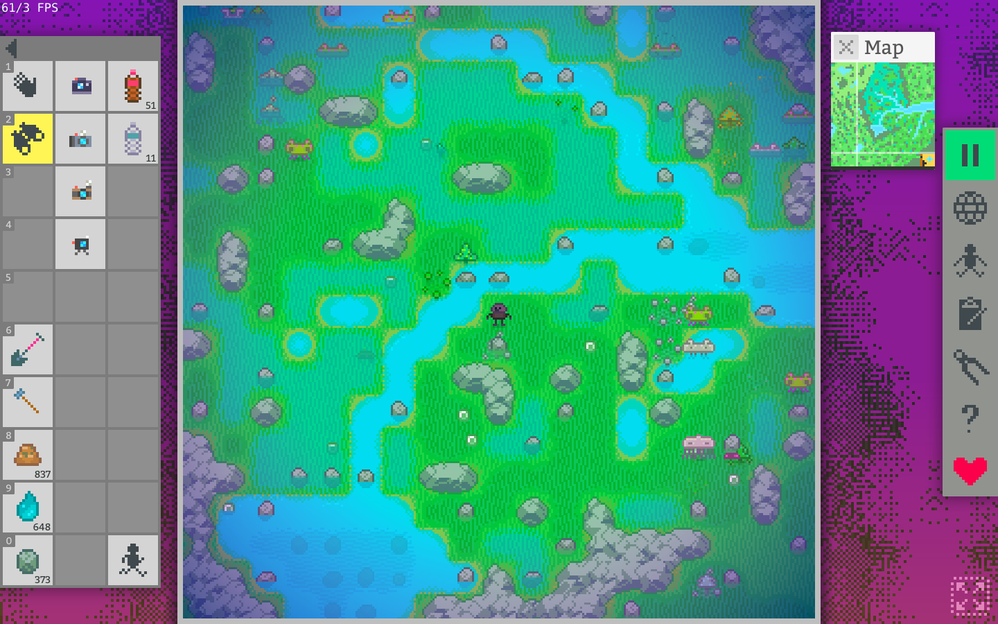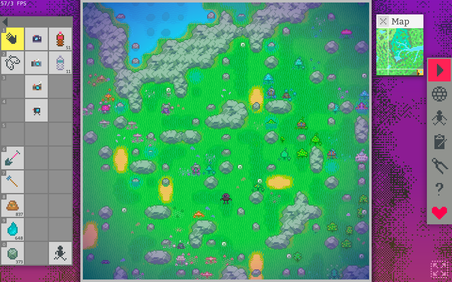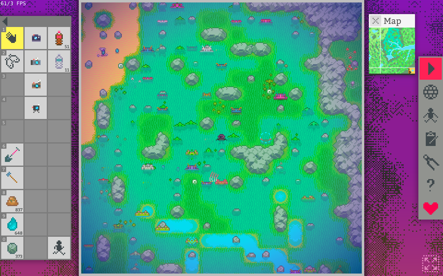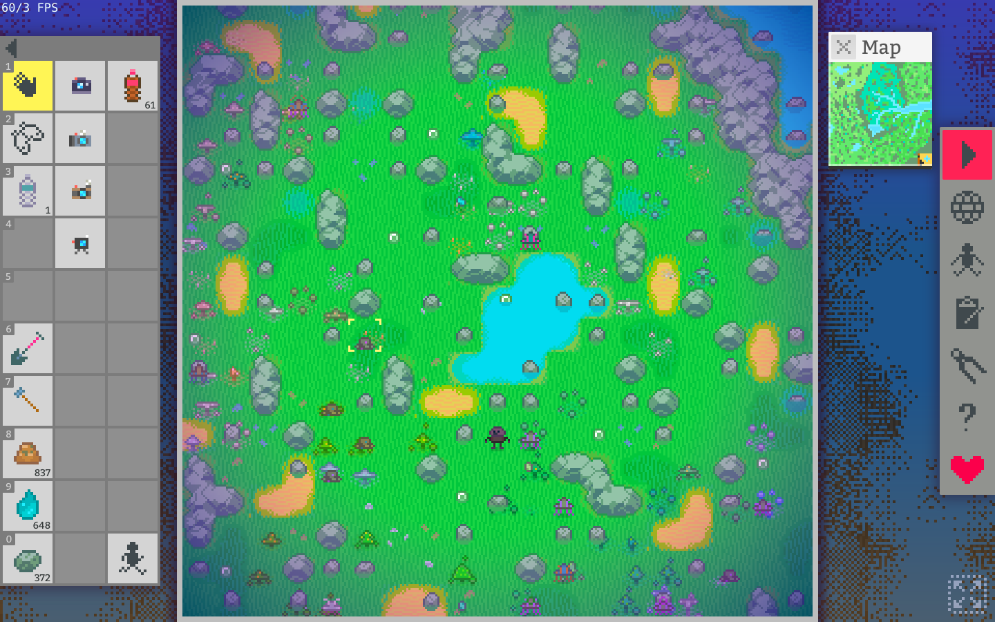 Arguably the most important item in the game is the Binoculars, which give you detailed information on any live anim you click on. Here you can see the aforementioned stats: nutrition (hunger), hydration (thirst), stress, fertility, and development (radiation is irrelevant on this map). “Diet” is a completely arbitrary distinction between herbivores, omnivores, and carnivores based on an anim’s attractions/repulsions to motion and scent, despite the fact that all anims will eat fungs, eggs, or corpses under the right conditions. Perception is the anim’s sensory perception. You might see this anim’s mobility and go “Wow! 10 tiles per second is really fast!”, but as I said earlier, this is almost entirely irrelevant due to anims only moving a single tile per metabolism tick. Generation is a nice way to see the relative age of a lineage, though other lineage-tracking tools are unfortunately lacking. Offspring is mildly interesting, counting the number of eggs this anim has laid in its lifetime. Age is very helpful, and can be used with the development bar to estimate the lifespan of an anim (for example, this anim looks like it very roughly lives to 1:30). Then, you can see the anim’s brain, and a slightly oddly-formatted readout of its genes (as adjacent bars). Hovering over a gene tells you its name— they are, from left to right, Masso (bone-related 1), Metabo (metabolism), Bendo (bone-related 2), Flexo (bone-related 3), Leggo (leg length), Senso (sensory perception), and then the brain genes, which consist of a prefix— Mo- for motion stimuli, Sce- for scent, and Wa- for water— and a suffix— -ho for hunger, -stro for stress, -tho for thirst. For example, Watho controls the attraction to water when thirsty (the bottom-right box in the brain), and Scestro controls attraction to scent when stressed (center box).