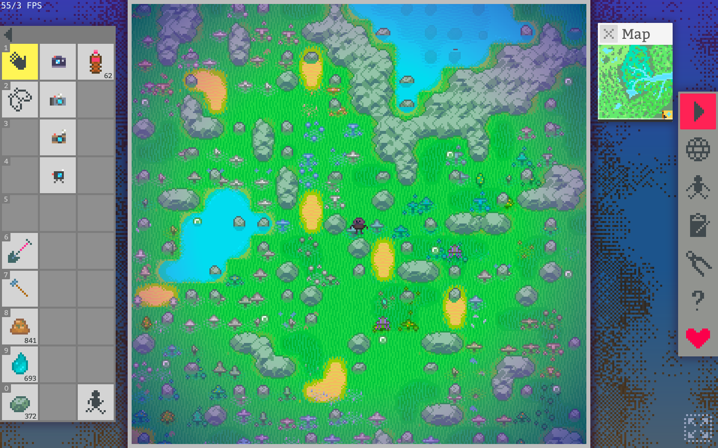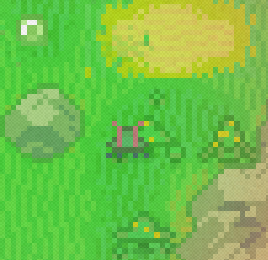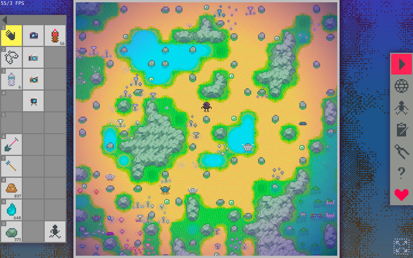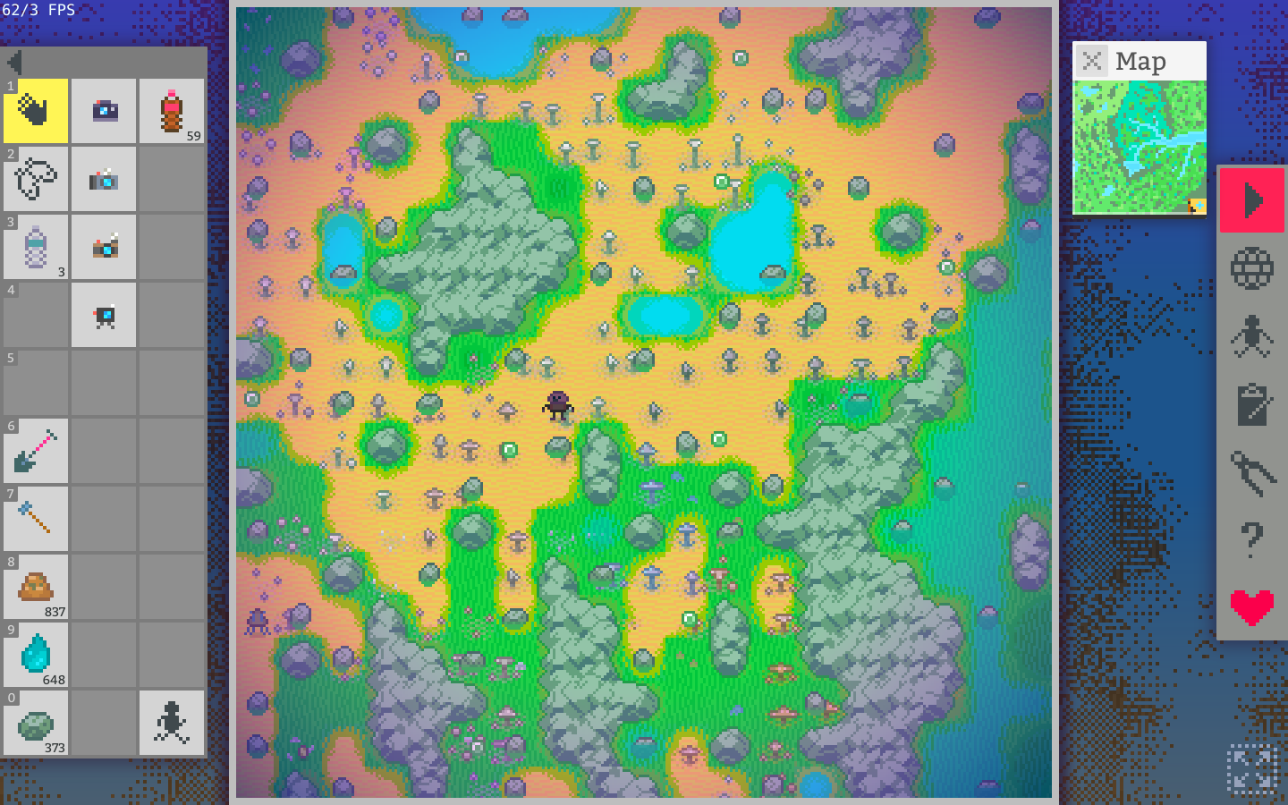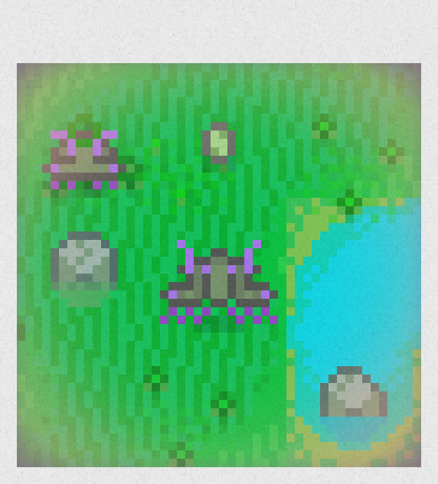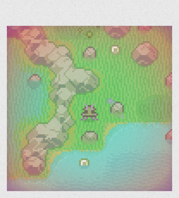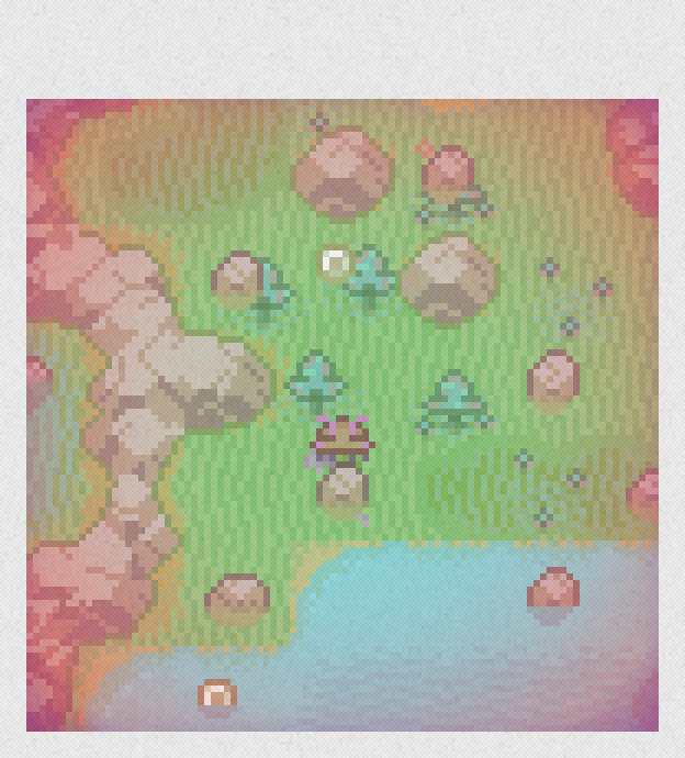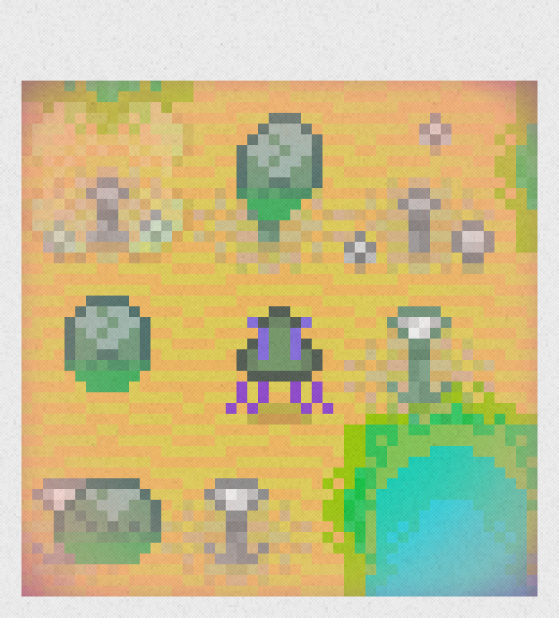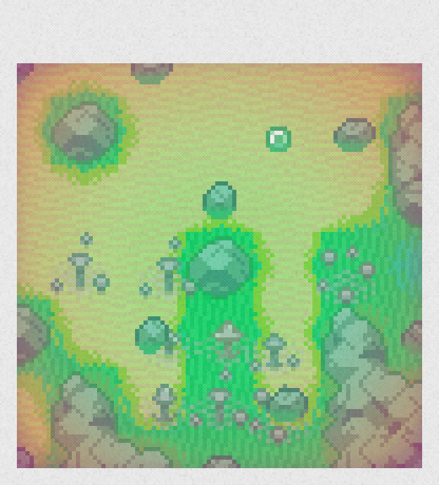 Vilmonic is tile-based and discrete, so everything is confined to a grid. Only one plant and one anim can occupy a tile at any given time, and anims can move orthogonally. Terrain is composed of various distinct tiles. The main ground tiles differ in “wetness”, which affects fungs’ and anims’ abilities to live on them. The four ground tiles are: “tundra” or “desert”, which is very dry; “dry”, which is sort of the basic tile; “wet”, which is wetter than dry; and “marsh”, which is much wetter and can be drunk from. Then, there’s two other relevant tiles: water, which is (obviously) very wet and on which fungs cannot grow, and rocks, which can’t be occupied by anims or fungs, purely blocking movement.