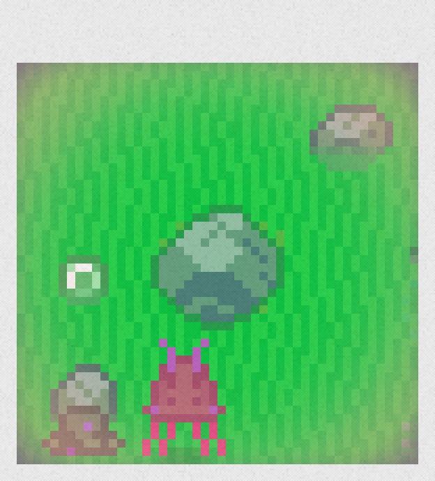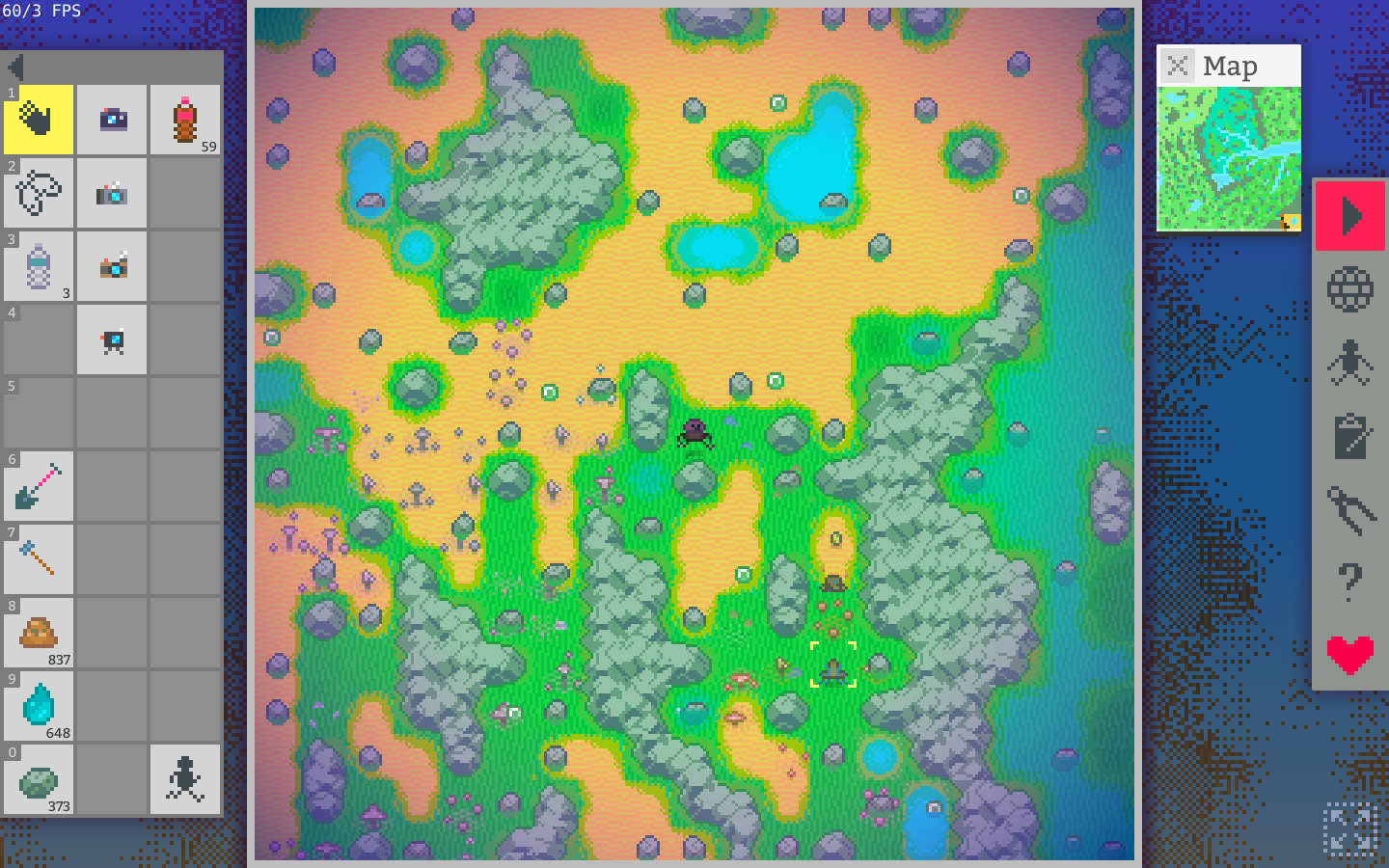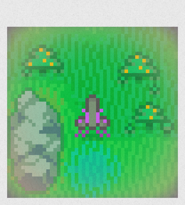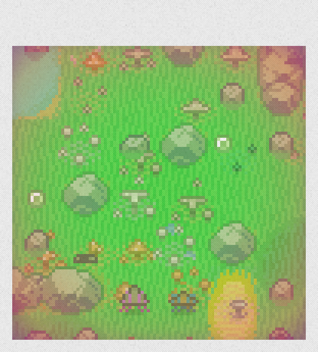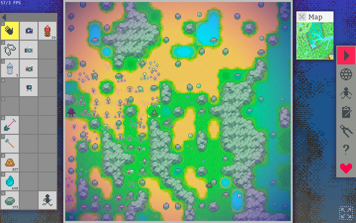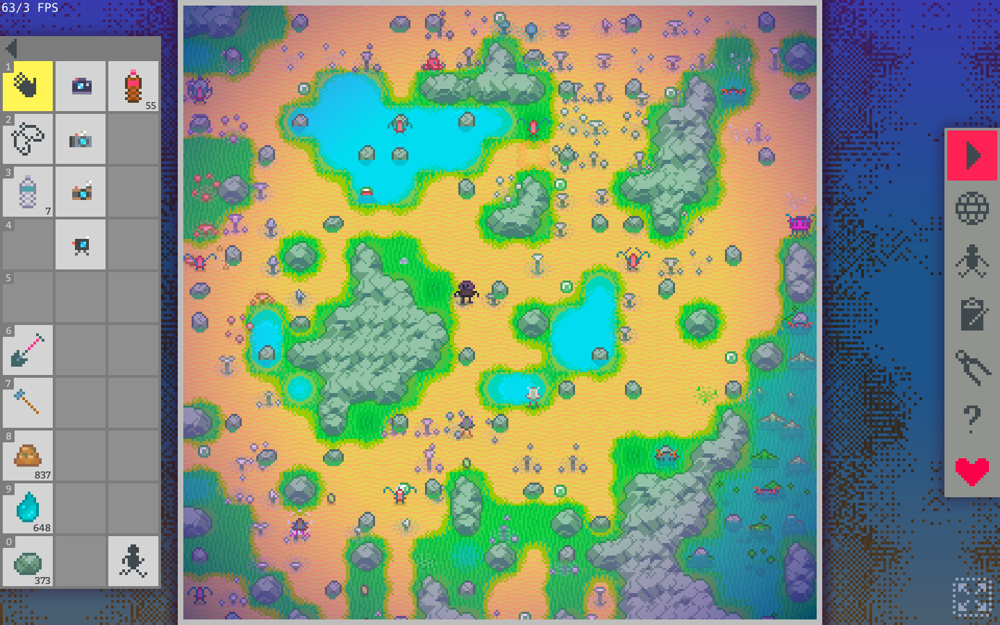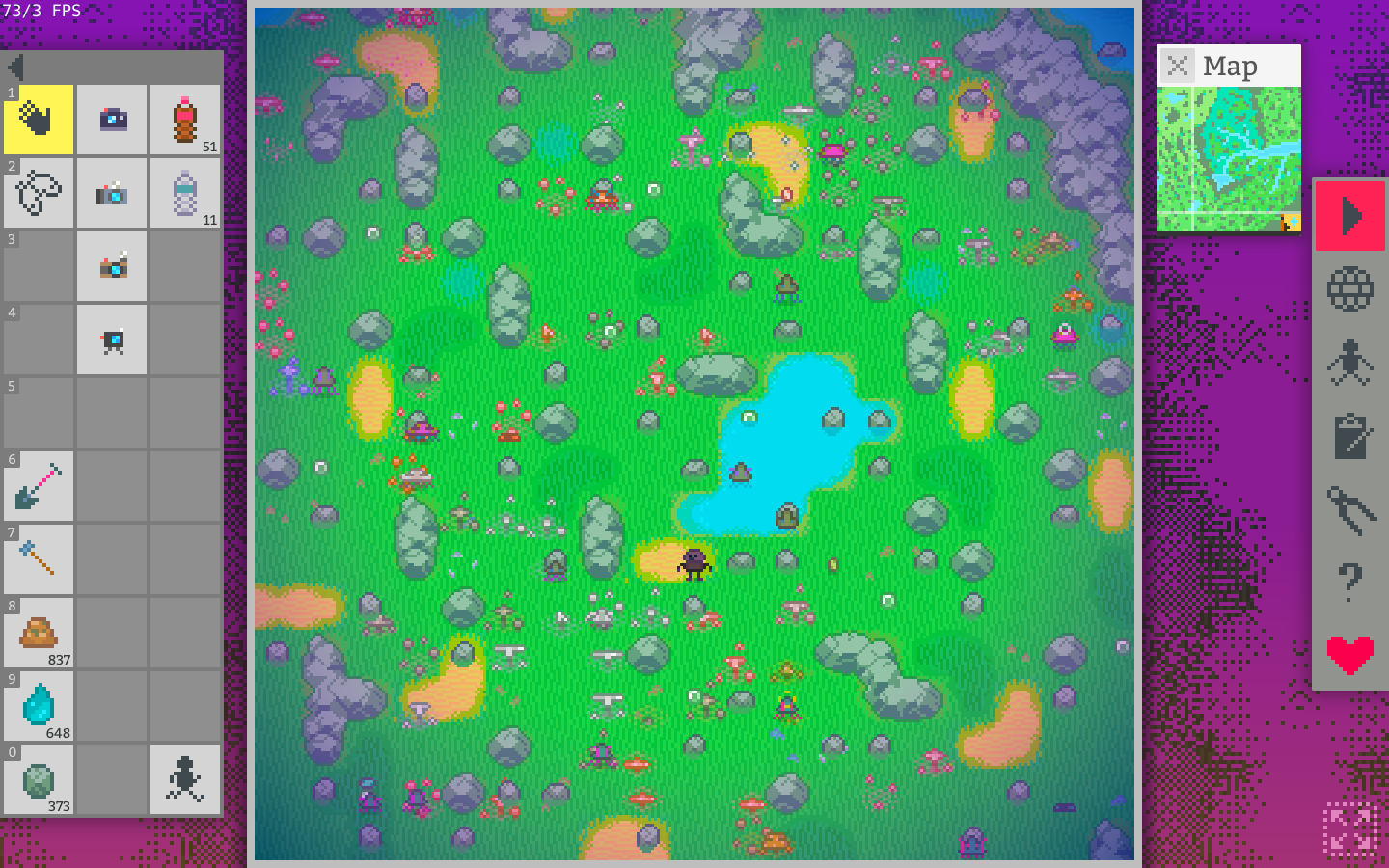 Vilmonic is tile-based and discrete, so everything is confined to a grid. Only one plant and one anim can occupy a tile at any given time, and anims can move orthogonally. Terrain is composed of various distinct tiles. The main ground tiles differ in “wetness”, which affects fungs’ and anims’ abilities to live on them. The four ground tiles are: “tundra” or “desert”, which is very dry; “dry”, which is sort of the basic tile; “wet”, which is wetter than dry; and “marsh”, which is much wetter and can be drunk from. Then, there’s two other relevant tiles: water, which is (obviously) very wet and on which fungs cannot grow, and rocks, which can’t be occupied by anims or fungs, purely blocking movement.