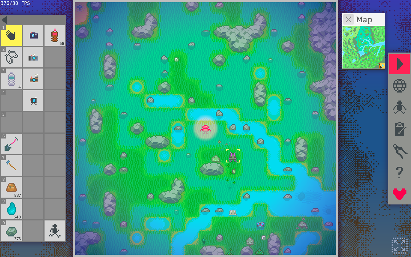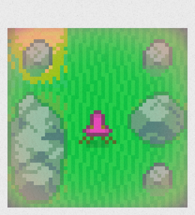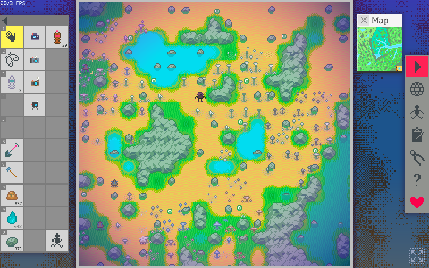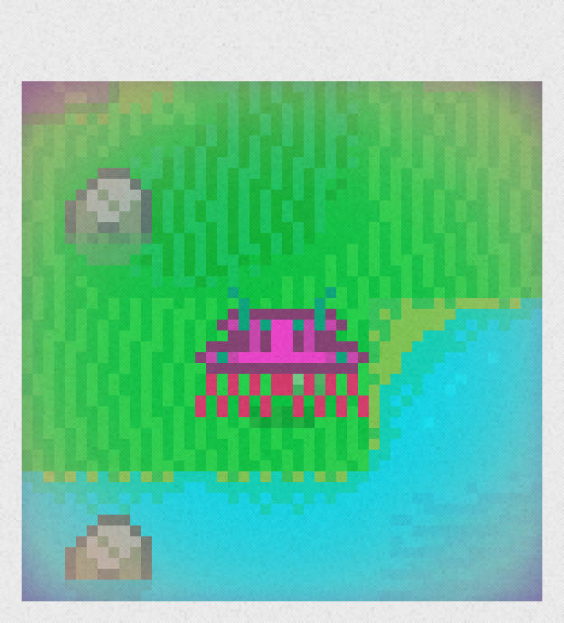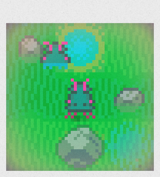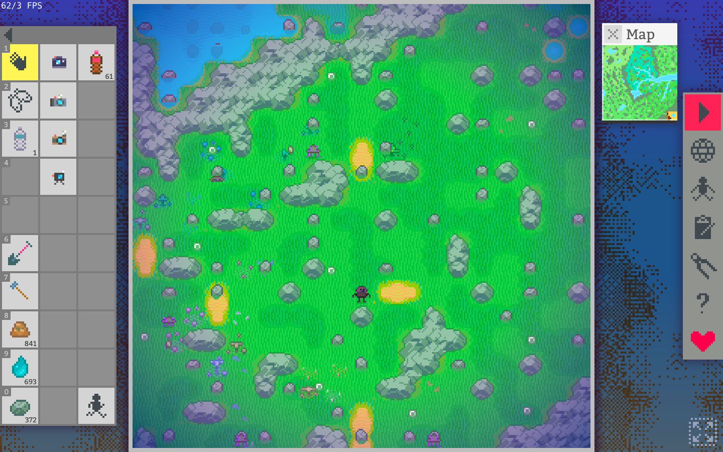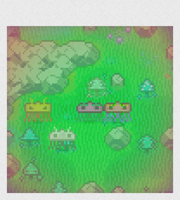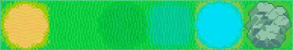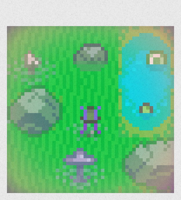 Vilmonic is tile-based and discrete, so everything is confined to a grid. Only one plant and one anim can occupy a tile at any given time, and anims can move orthogonally. Terrain is composed of various distinct tiles. The main ground tiles differ in “wetness”, which affects fungs’ and anims’ abilities to live on them. The four ground tiles are: “tundra” or “desert”, which is very dry; “dry”, which is sort of the basic tile; “wet”, which is wetter than dry; and “marsh”, which is much wetter and can be drunk from. Then, there’s two other relevant tiles: water, which is (obviously) very wet and on which fungs cannot grow, and rocks, which can’t be occupied by anims or fungs, purely blocking movement.