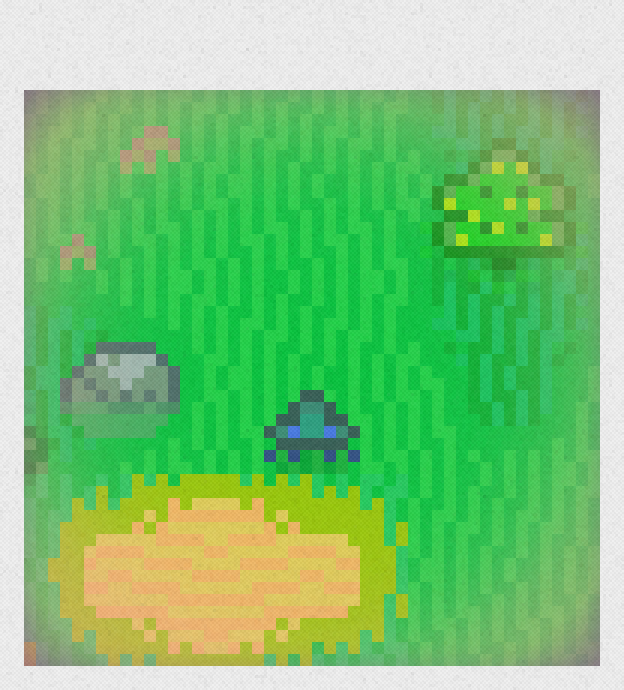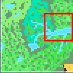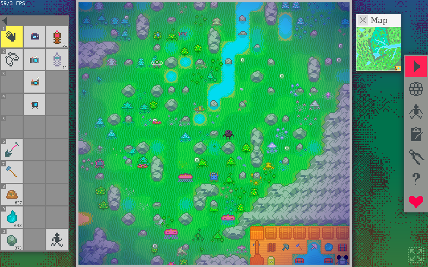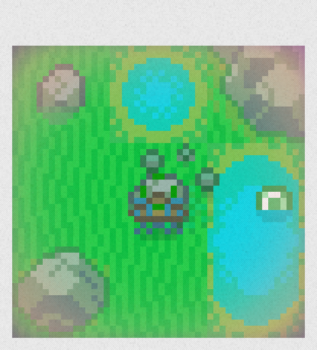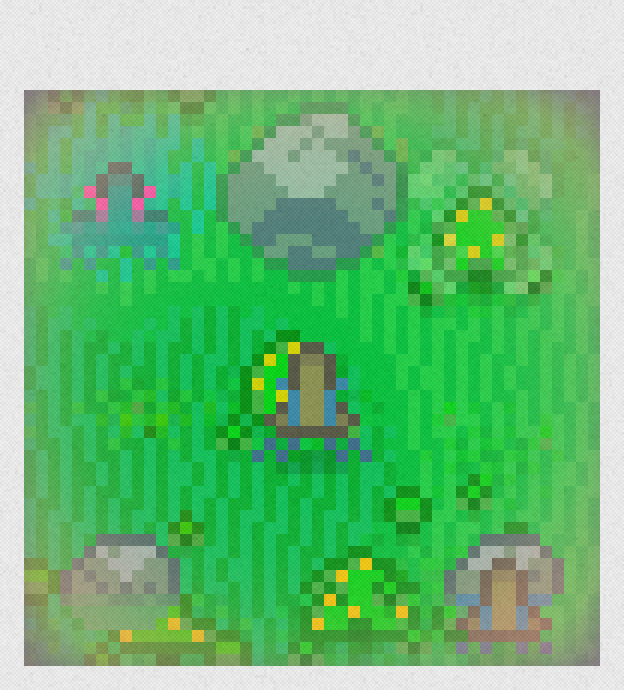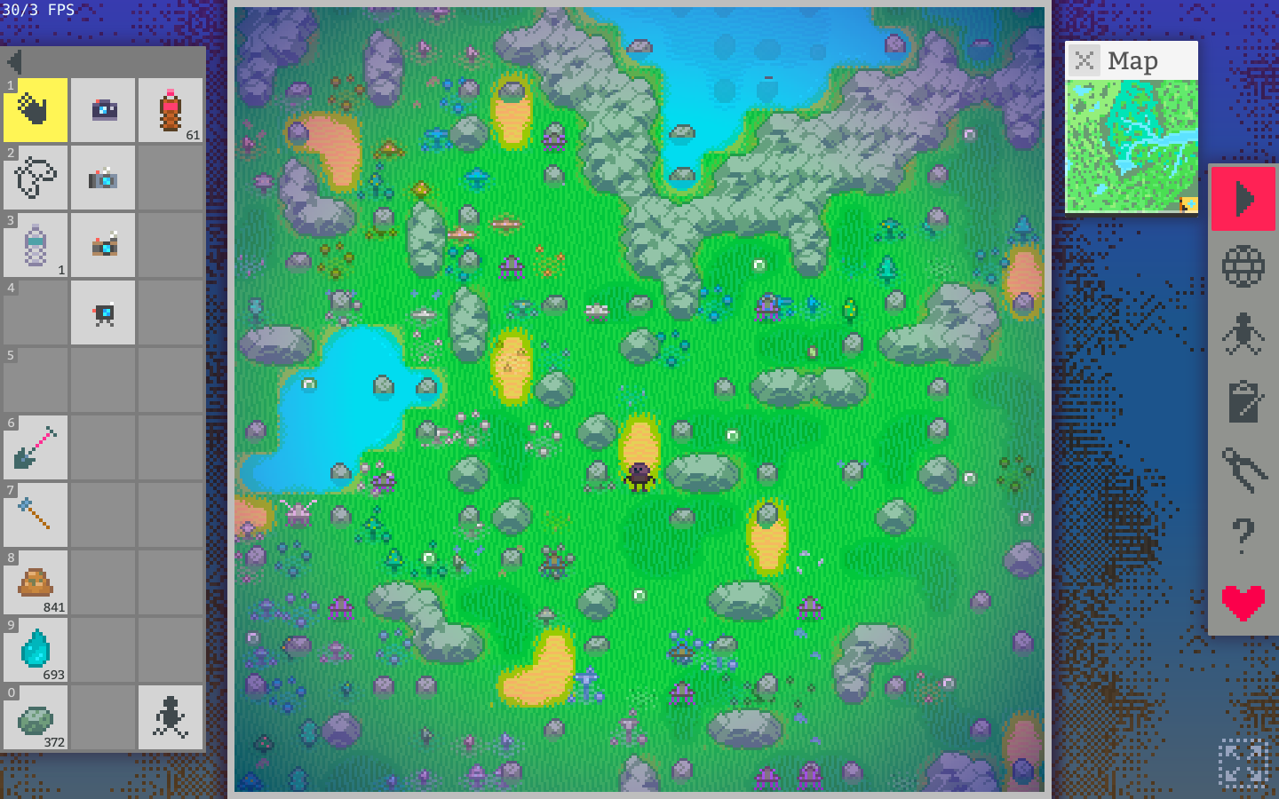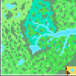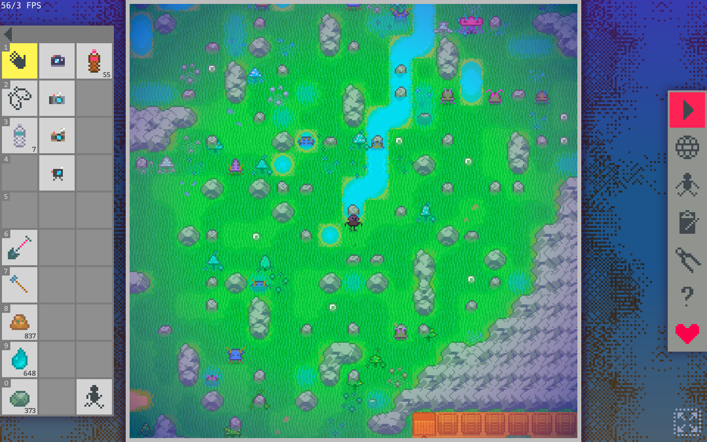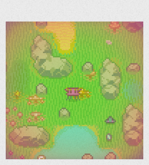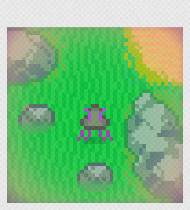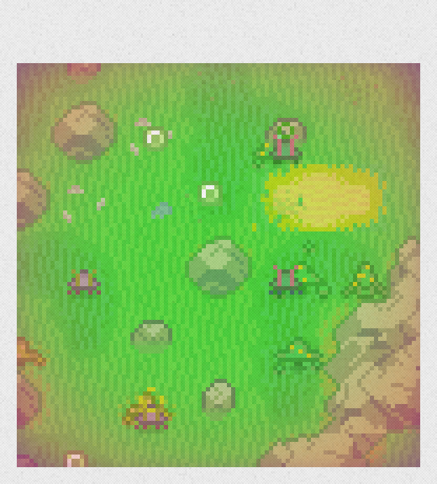 Vilmonic is tile-based and discrete, so everything is confined to a grid. Only one plant and one anim can occupy a tile at any given time, and anims can move orthogonally. Terrain is composed of various distinct tiles. The main ground tiles differ in “wetness”, which affects fungs’ and anims’ abilities to live on them. The four ground tiles are: “tundra” or “desert”, which is very dry; “dry”, which is sort of the basic tile; “wet”, which is wetter than dry; and “marsh”, which is much wetter and can be drunk from. Then, there’s two other relevant tiles: water, which is (obviously) very wet and on which fungs cannot grow, and rocks, which can’t be occupied by anims or fungs, purely blocking movement.