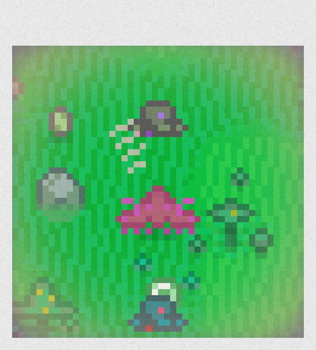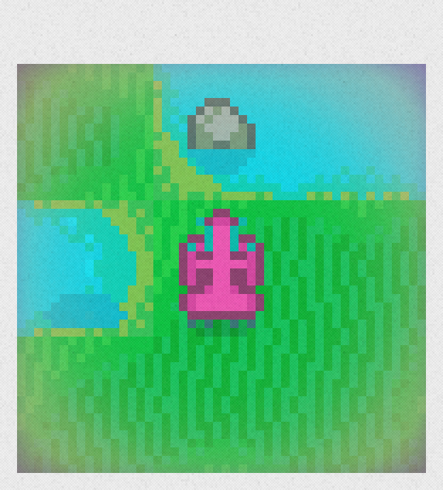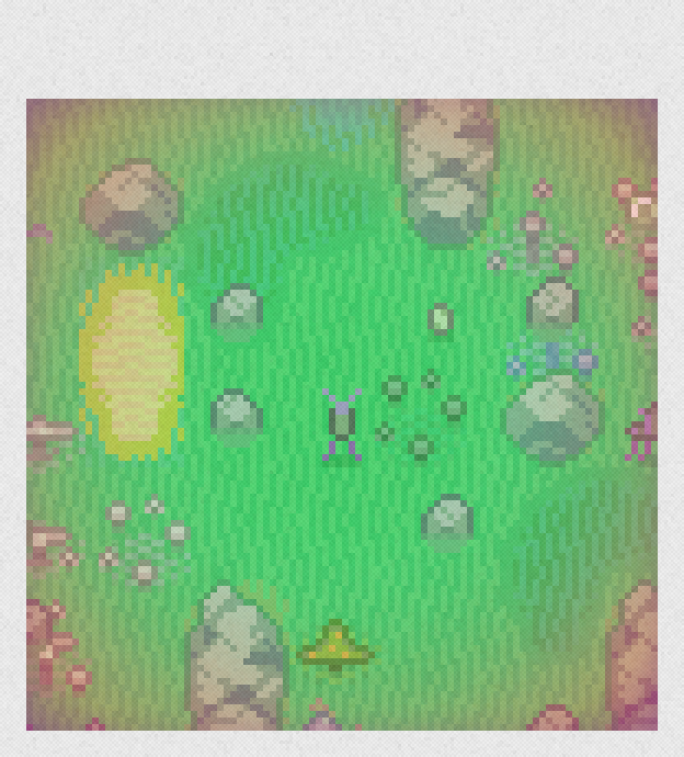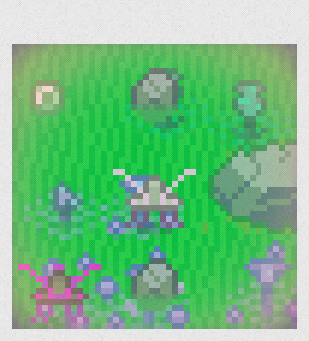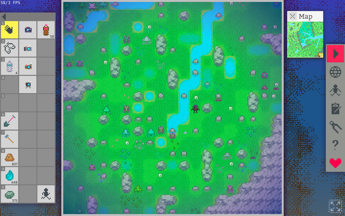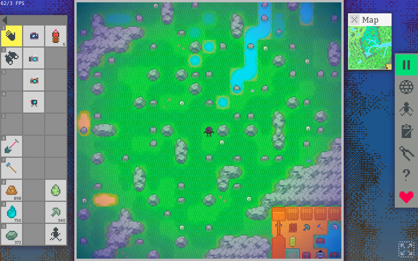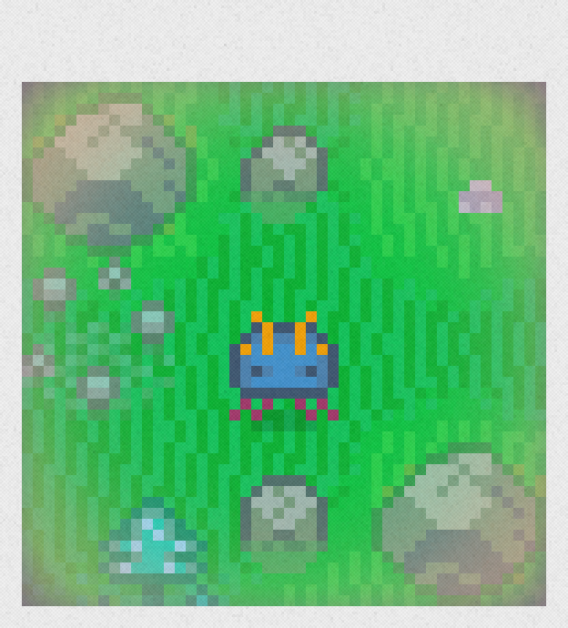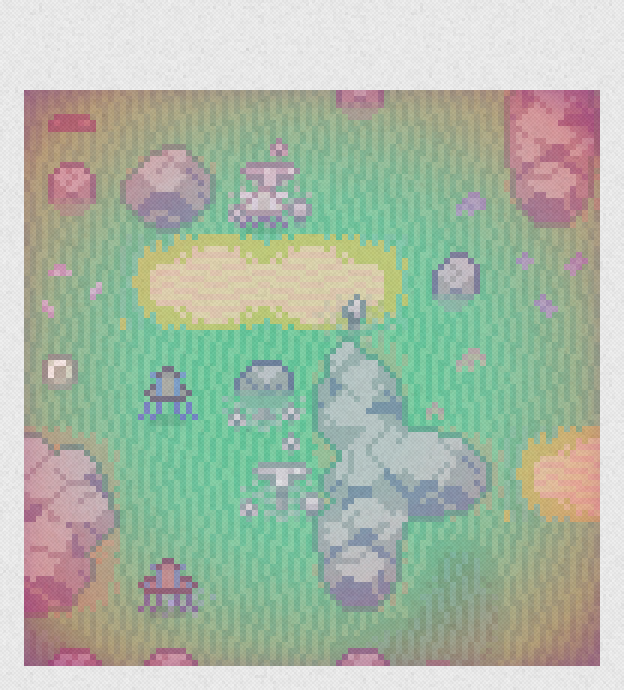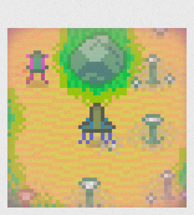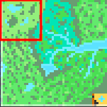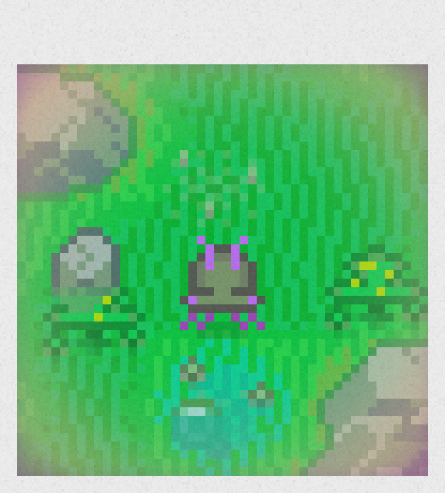 Vilmonic is tile-based and discrete, so everything is confined to a grid. Only one plant and one anim can occupy a tile at any given time, and anims can move orthogonally. Terrain is composed of various distinct tiles. The main ground tiles differ in “wetness”, which affects fungs’ and anims’ abilities to live on them. The four ground tiles are: “tundra” or “desert”, which is very dry; “dry”, which is sort of the basic tile; “wet”, which is wetter than dry; and “marsh”, which is much wetter and can be drunk from. Then, there’s two other relevant tiles: water, which is (obviously) very wet and on which fungs cannot grow, and rocks, which can’t be occupied by anims or fungs, purely blocking movement.