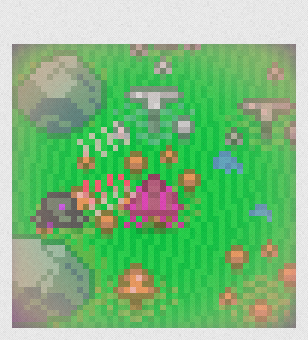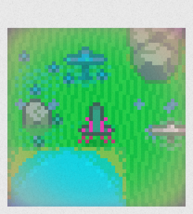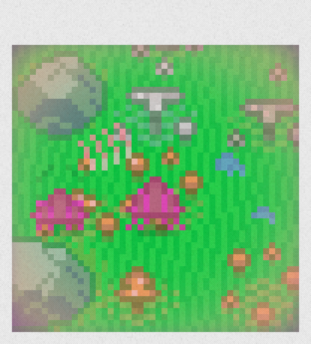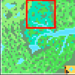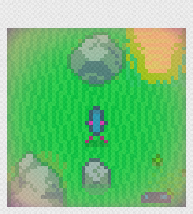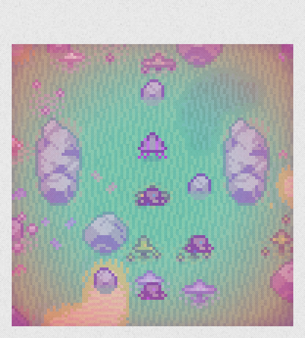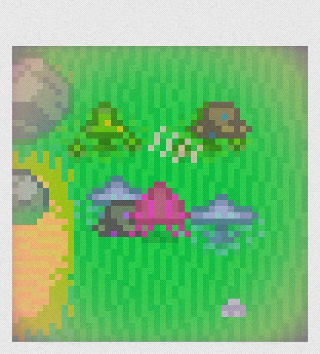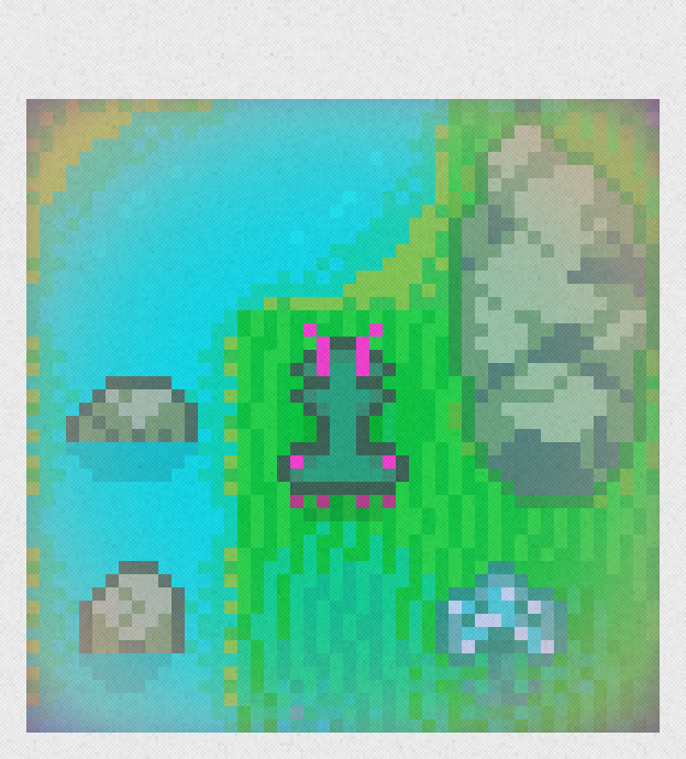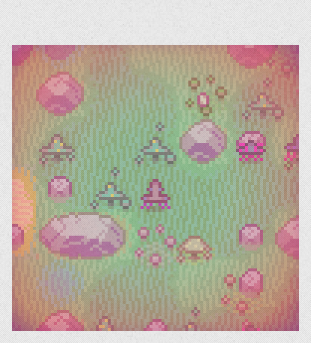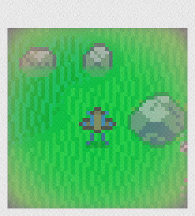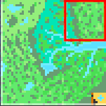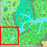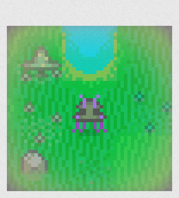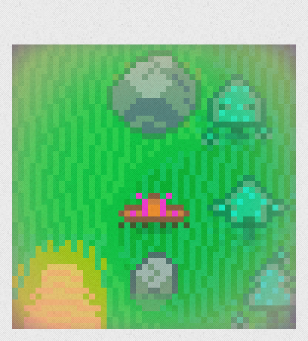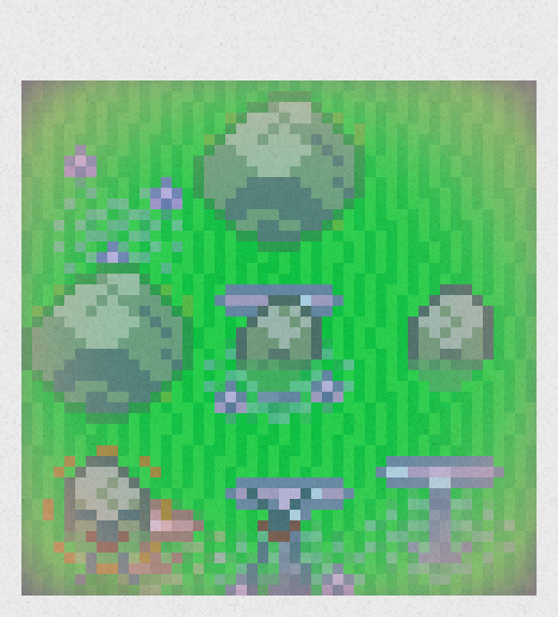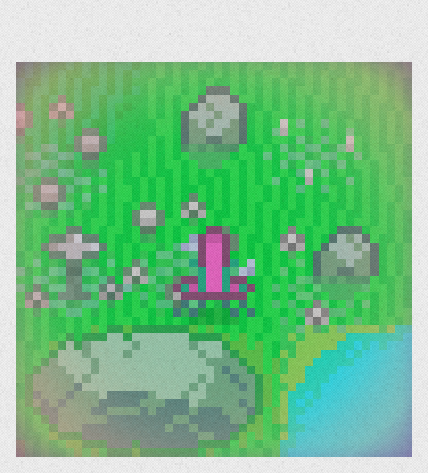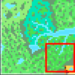 Vilmonic is tile-based and discrete, so everything is confined to a grid. Only one plant and one anim can occupy a tile at any given time, and anims can move orthogonally. Terrain is composed of various distinct tiles. The main ground tiles differ in “wetness”, which affects fungs’ and anims’ abilities to live on them. The four ground tiles are: “tundra” or “desert”, which is very dry; “dry”, which is sort of the basic tile; “wet”, which is wetter than dry; and “marsh”, which is much wetter and can be drunk from. Then, there’s two other relevant tiles: water, which is (obviously) very wet and on which fungs cannot grow, and rocks, which can’t be occupied by anims or fungs, purely blocking movement.