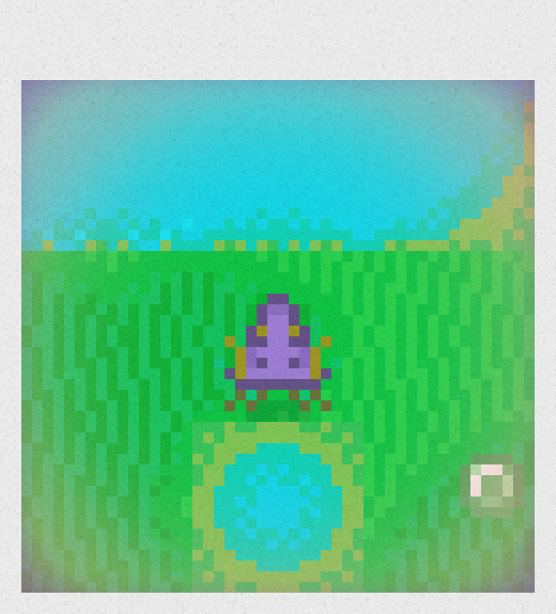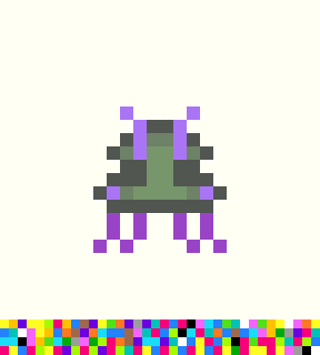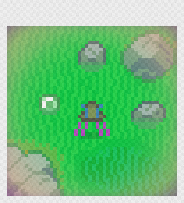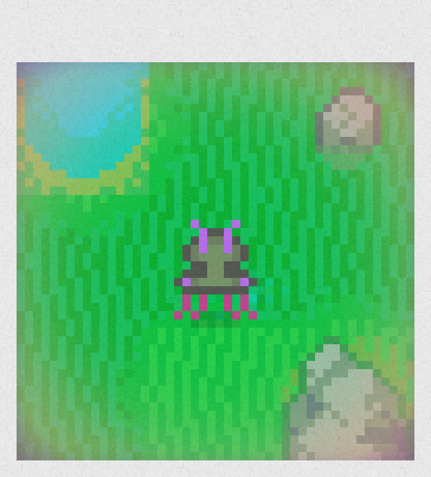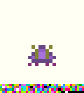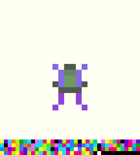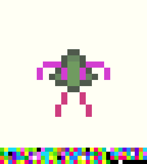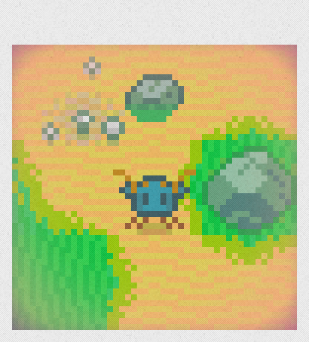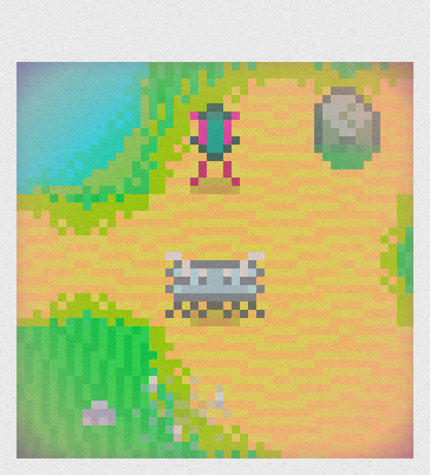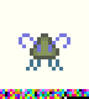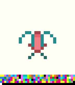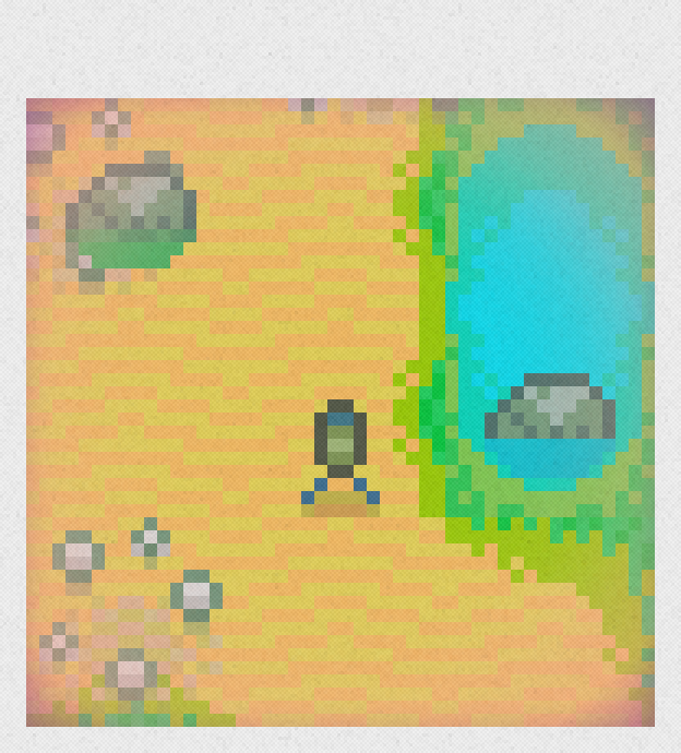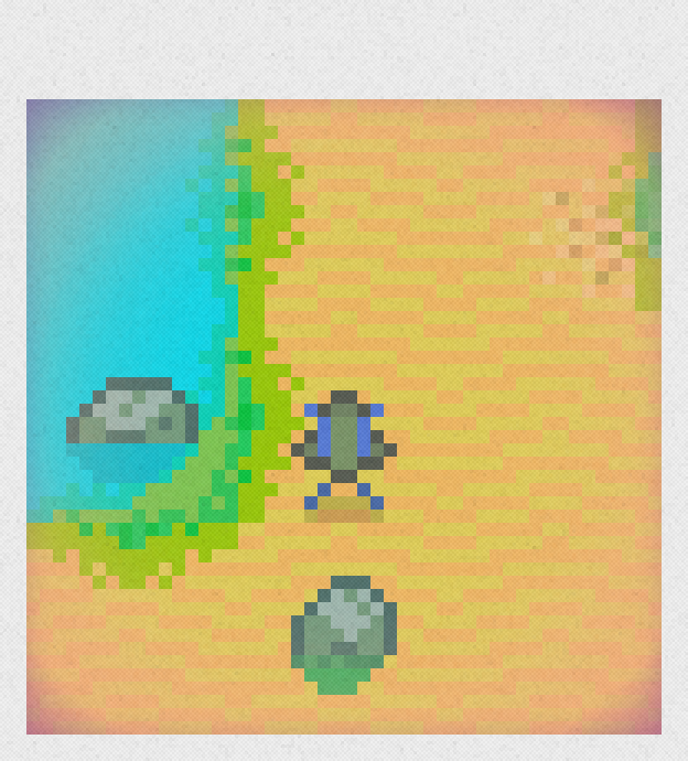 A key mechanic in Vilmonic is the retention and loss of water: the ratio of light flesh pixels to dark skin pixels around the edges of the anim determines how quickly an anim loses water. Anims passively gain water when standing on any tile (with very little water from tundra and quite a lot from marsh), but the amount it loses at the same time determines whether it has a net gain or loss of water from standing on a tile. Most dry anims have a net loss and are therefore forced to drink, while wet anims and extremely small desert anims like the one above are often adapted to stay almost neutral in their environments, removing the need to focus on drinking.