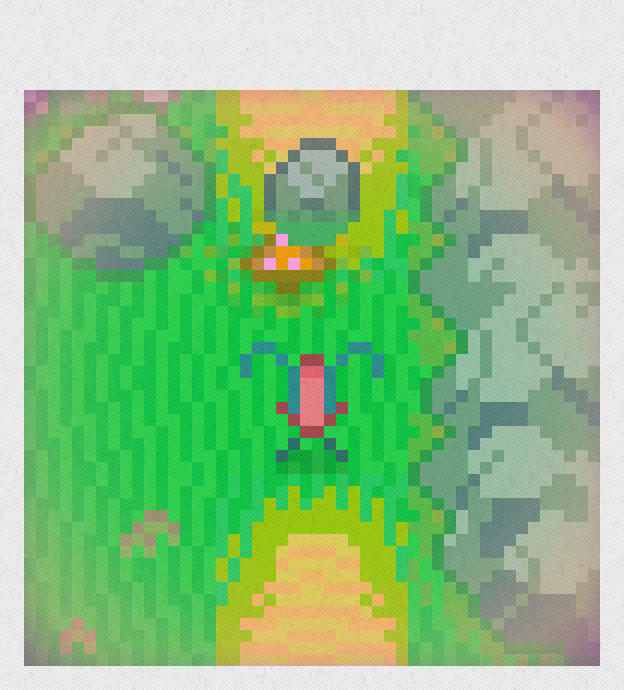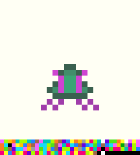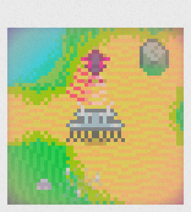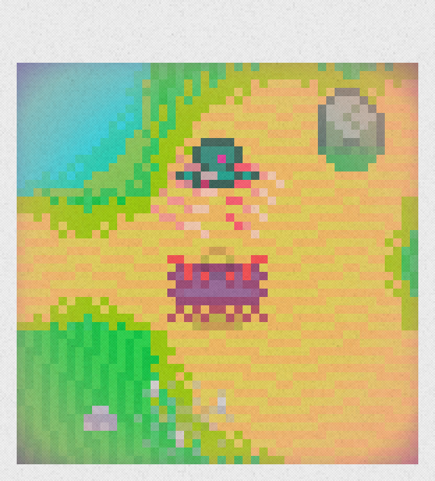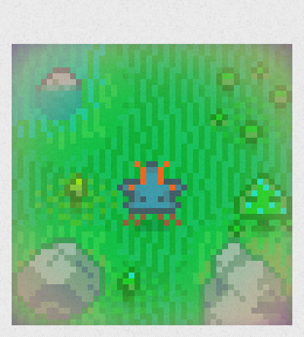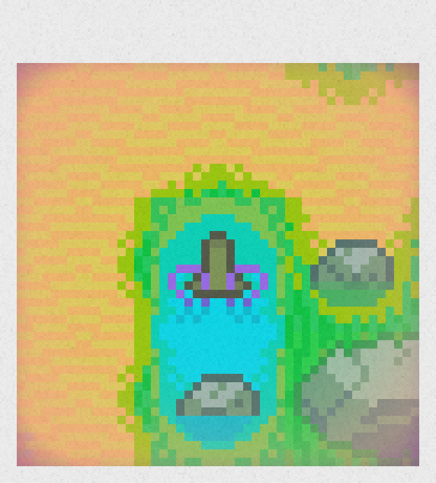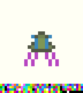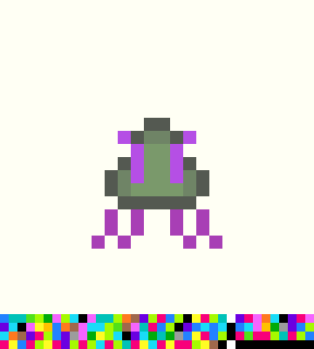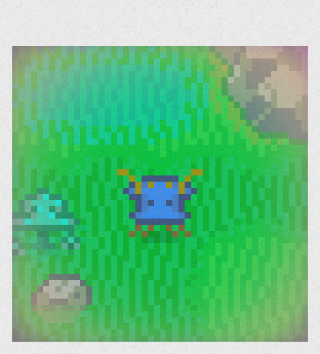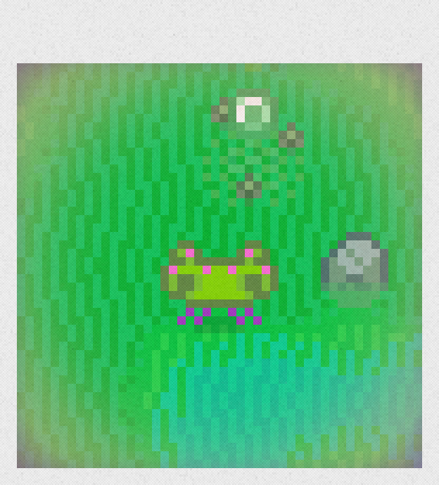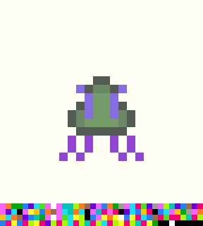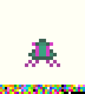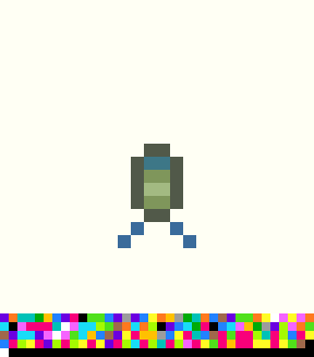 A key mechanic in Vilmonic is the retention and loss of water: the ratio of light flesh pixels to dark skin pixels around the edges of the anim determines how quickly an anim loses water. Anims passively gain water when standing on any tile (with very little water from tundra and quite a lot from marsh), but the amount it loses at the same time determines whether it has a net gain or loss of water from standing on a tile. Most dry anims have a net loss and are therefore forced to drink, while wet anims and extremely small desert anims like the one above are often adapted to stay almost neutral in their environments, removing the need to focus on drinking.
