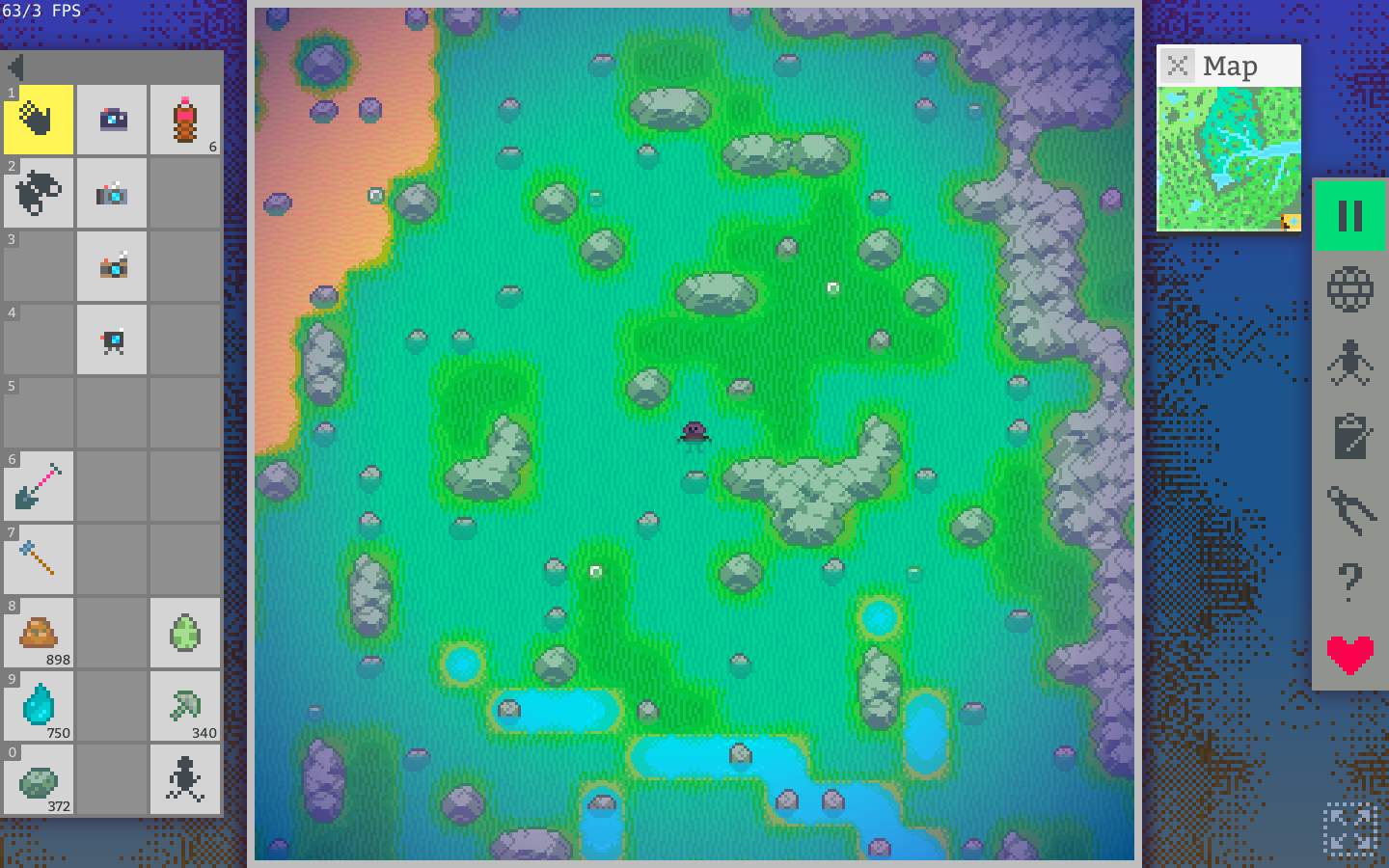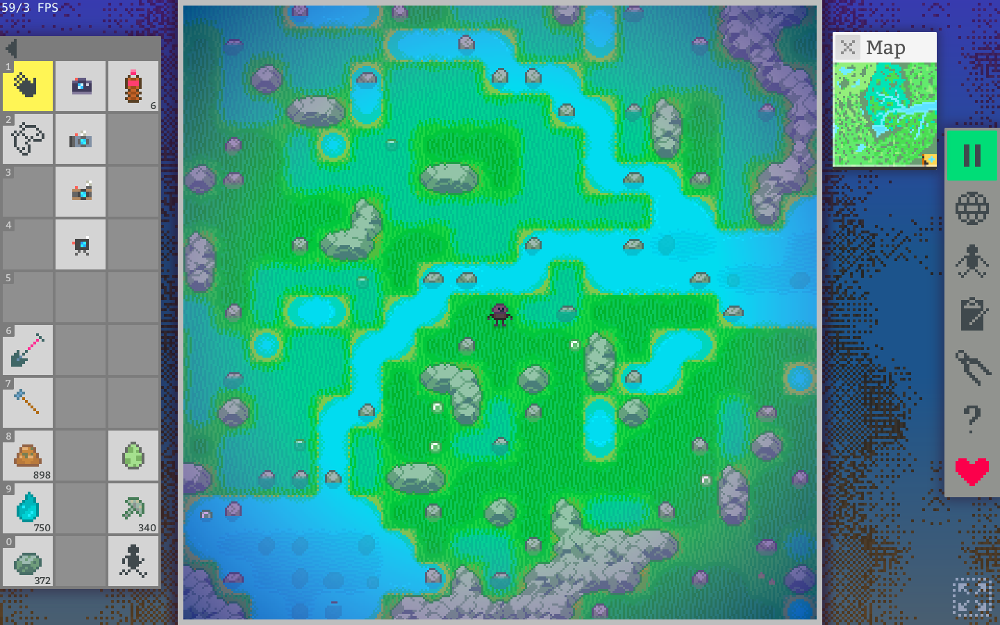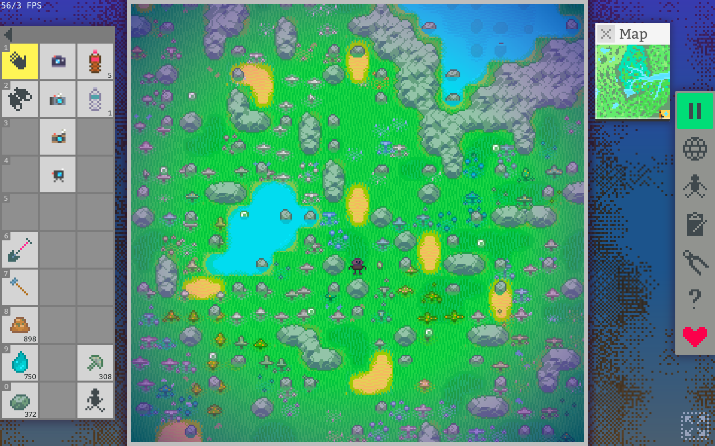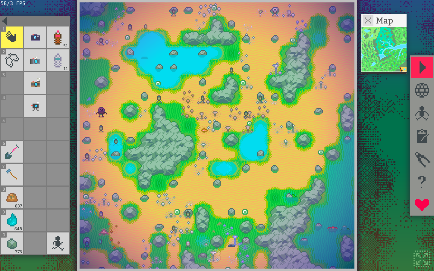 There’s a lot of patterns and tips I’ve learned from the many worlds I’ve terraformed. There’s five things I like to focus on: obstacles in any biome, specific biomes, biome location (i.e., what biomes are adjacent?), fung density and ability to spread, and water. One of the most important factors that determine how an anim population evolves is the “easiness” of an environment: is it full of rocks like a cave, or are there no rocks? Does it consist of various different tiles, or only one? Are there plenty of fungs or very few? The easier a biome, the more anims tend towards densely-packed populations with high metabolism (which I generally don’t like; it’s hard for me to focus on specific anims when there’s so many).