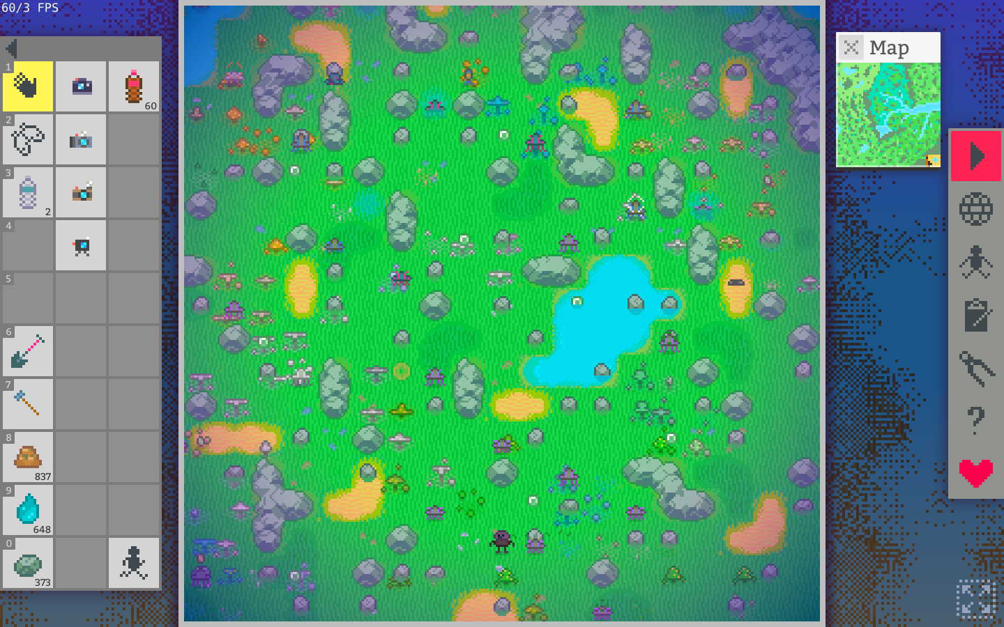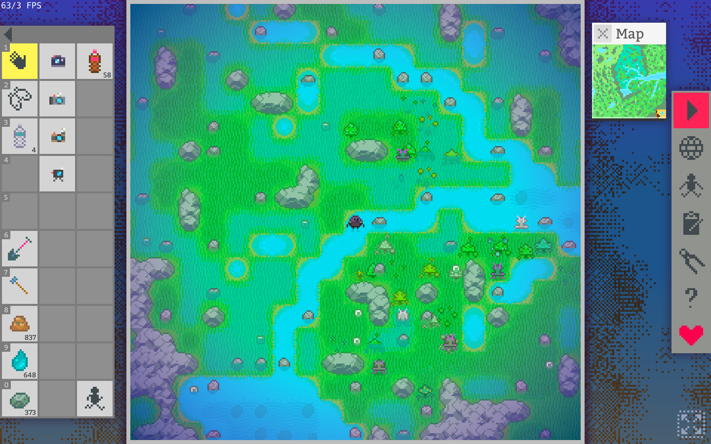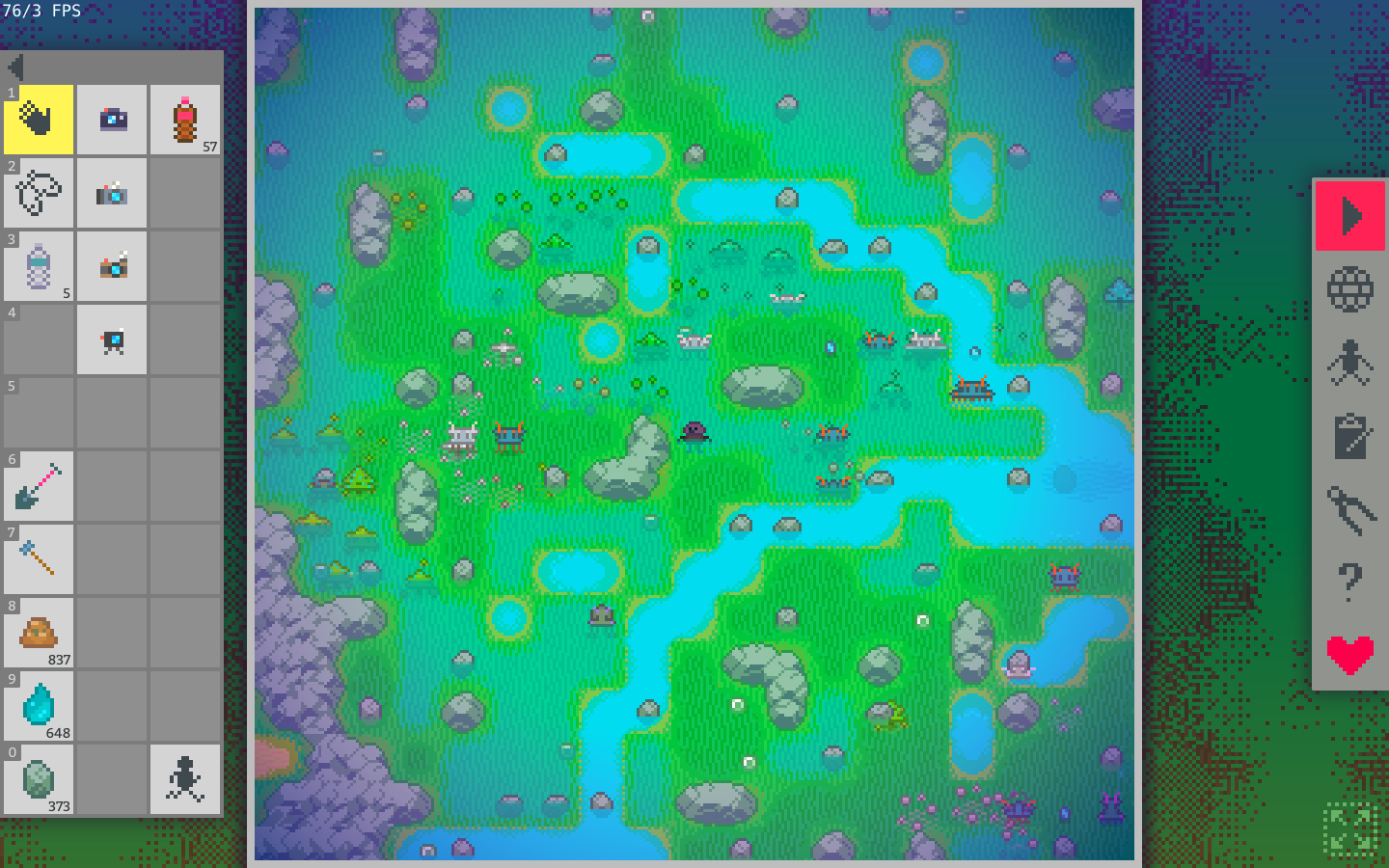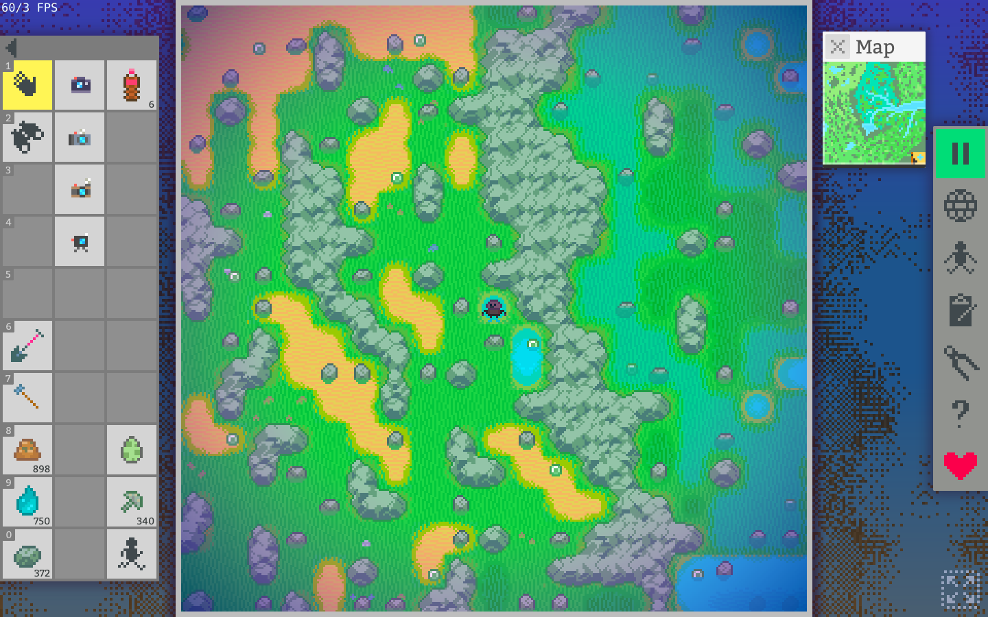 There’s a lot of patterns and tips I’ve learned from the many worlds I’ve terraformed. There’s five things I like to focus on: obstacles in any biome, specific biomes, biome location (i.e., what biomes are adjacent?), fung density and ability to spread, and water. One of the most important factors that determine how an anim population evolves is the “easiness” of an environment: is it full of rocks like a cave, or are there no rocks? Does it consist of various different tiles, or only one? Are there plenty of fungs or very few? The easier a biome, the more anims tend towards densely-packed populations with high metabolism (which I generally don’t like; it’s hard for me to focus on specific anims when there’s so many).