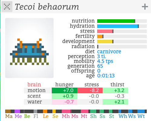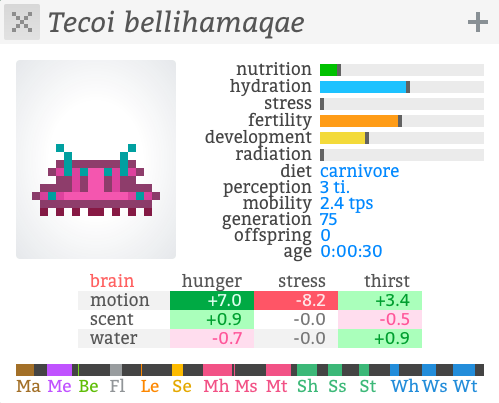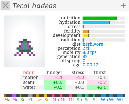 In addition to its adaptable body shape, 3-tile sensory range, and 2-minute lifespan, Dehaibus starts out with a somewhat neutral brain— perfect for a progenitor.