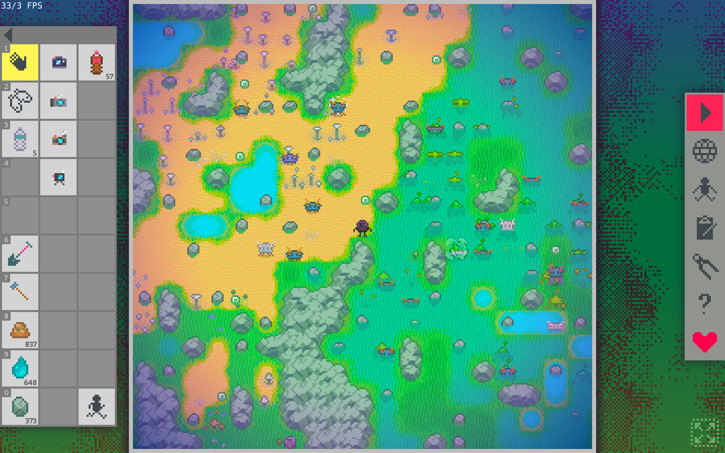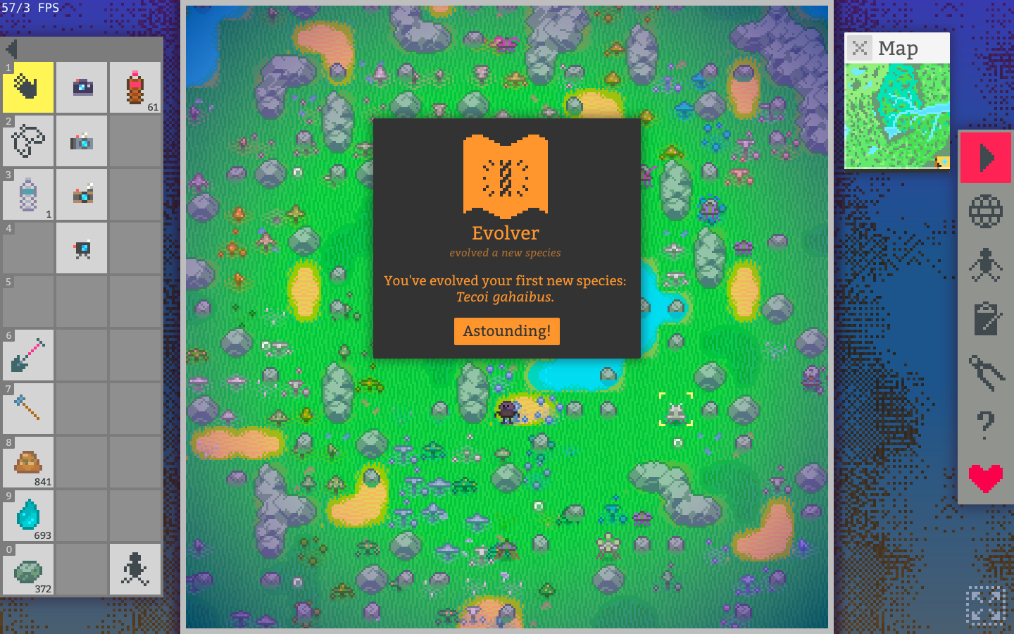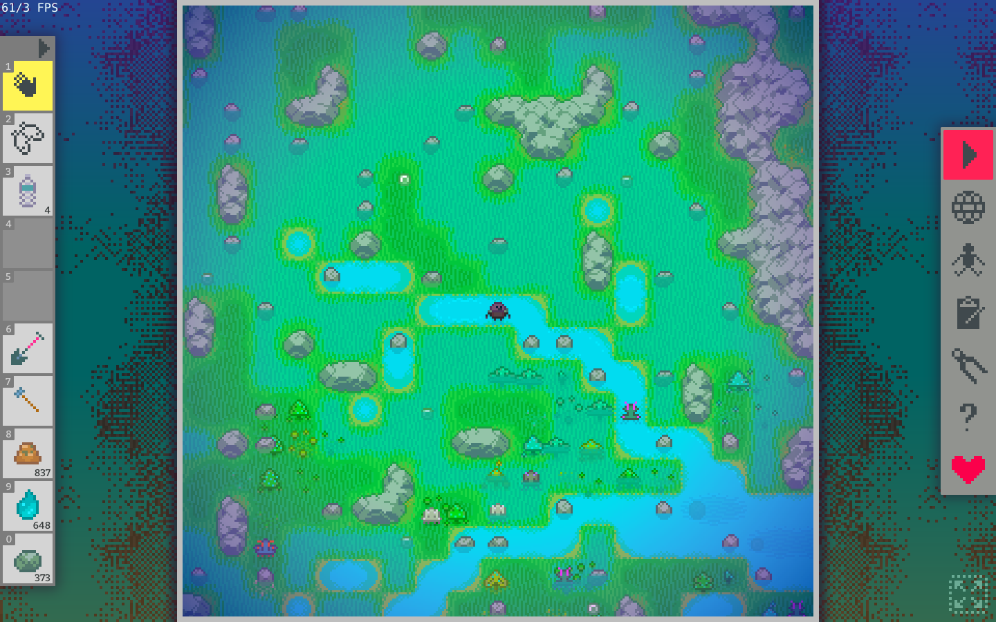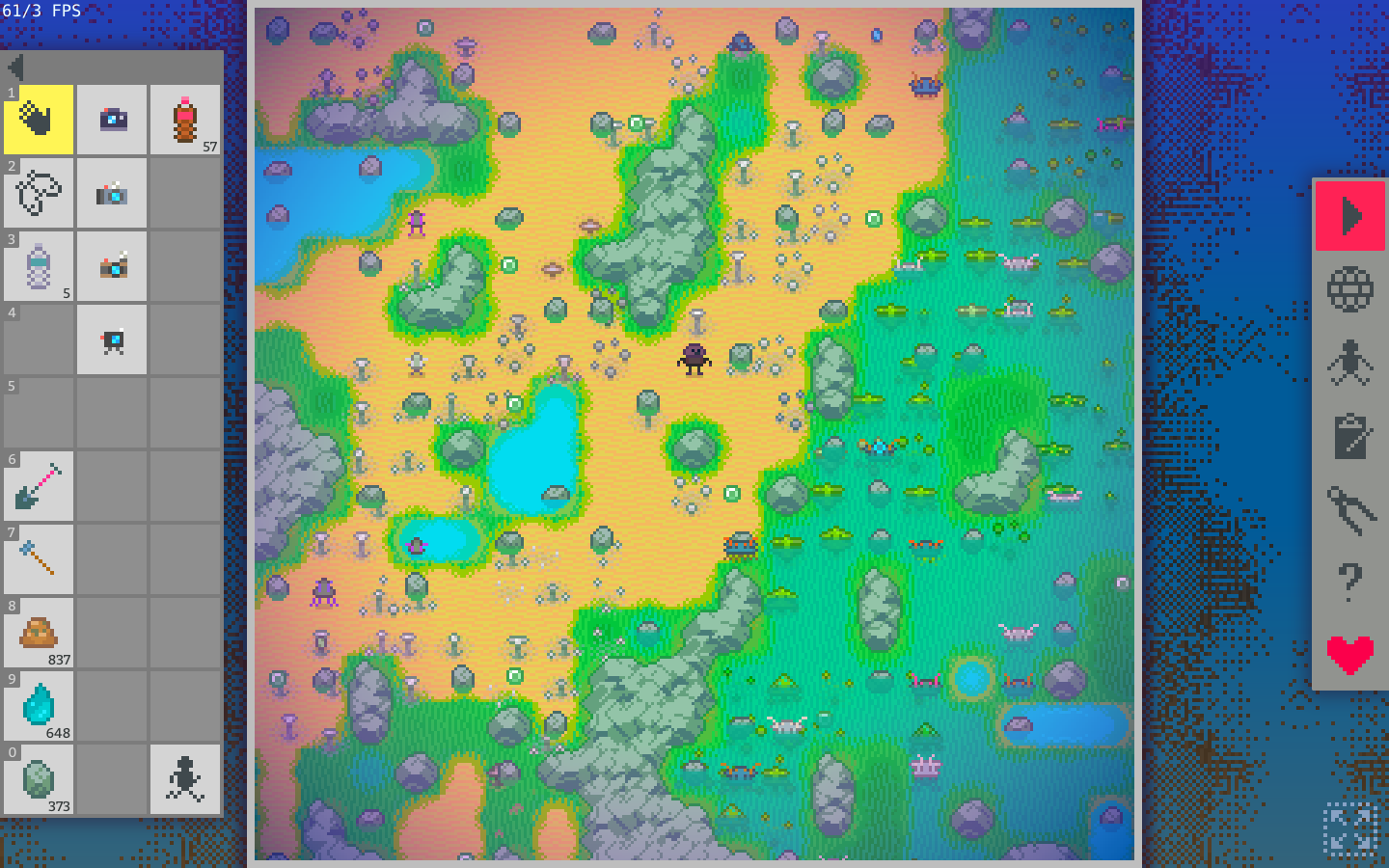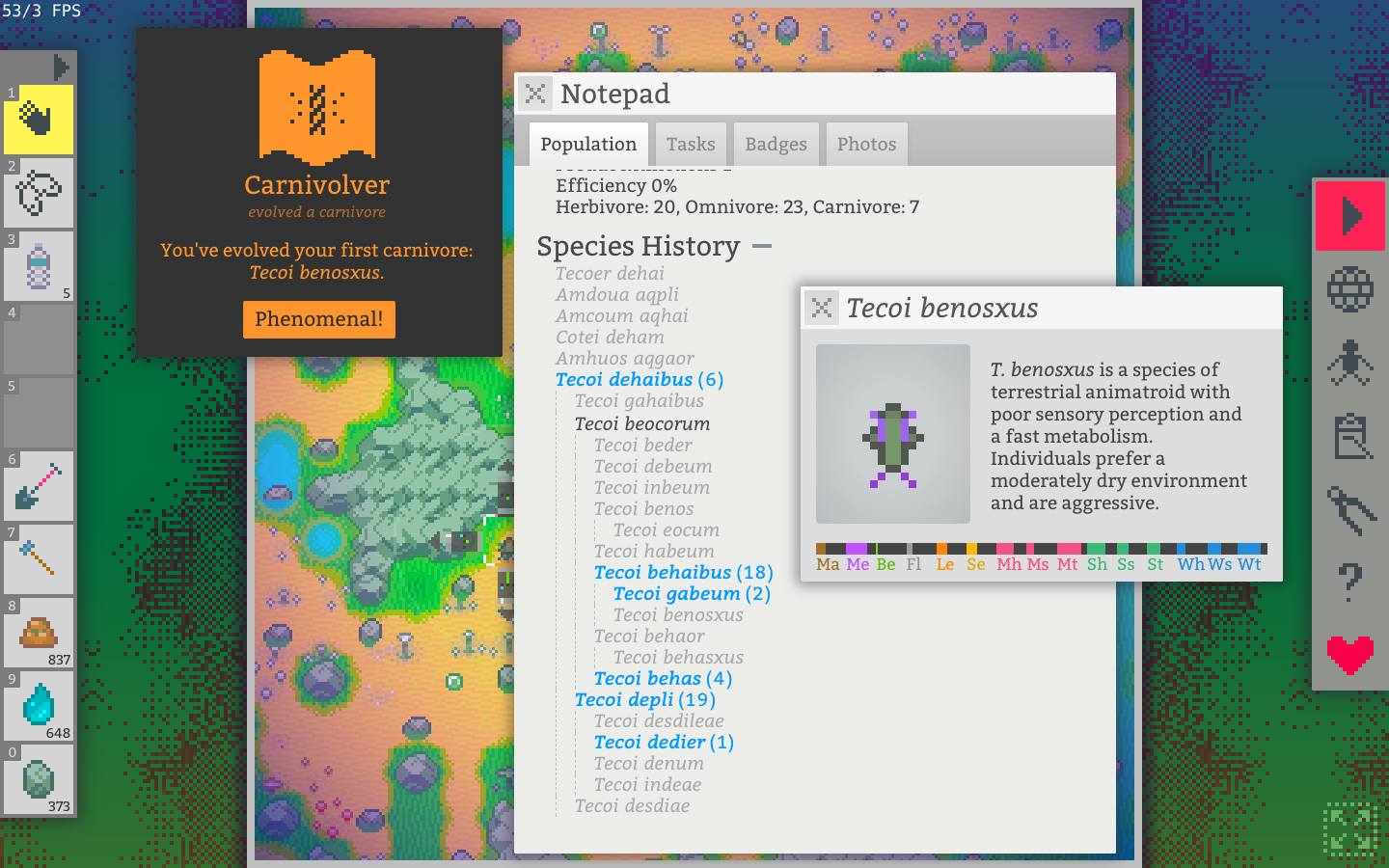 Tile diversity is also quite important; since it’s much easier for anims to adapt to one tile type in particular (e.g. developing a body that barely loses water when standing on that tile), having several they need to live on encourages them to be more hardy, which takes evolutionary resources. However, this usually results in more homogenous body shapes, since the more exotic ones are generally specialized for one tile type.