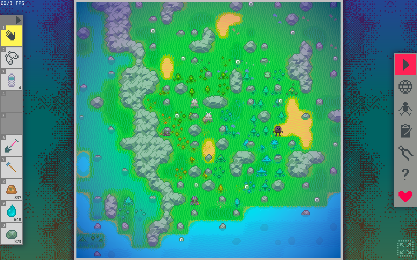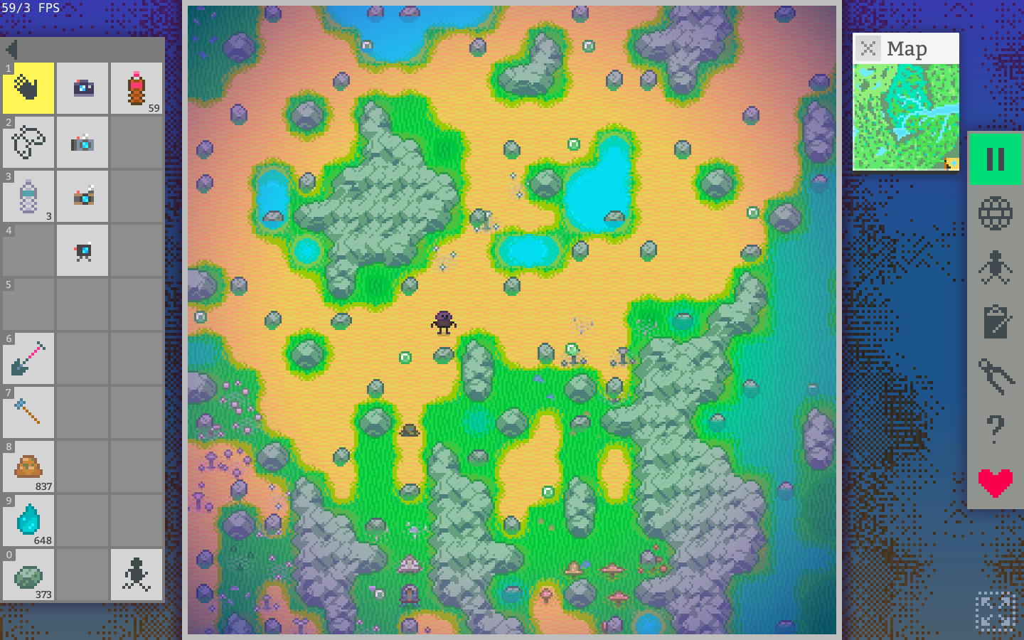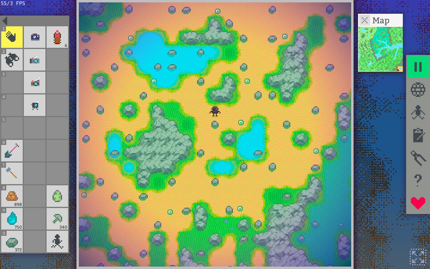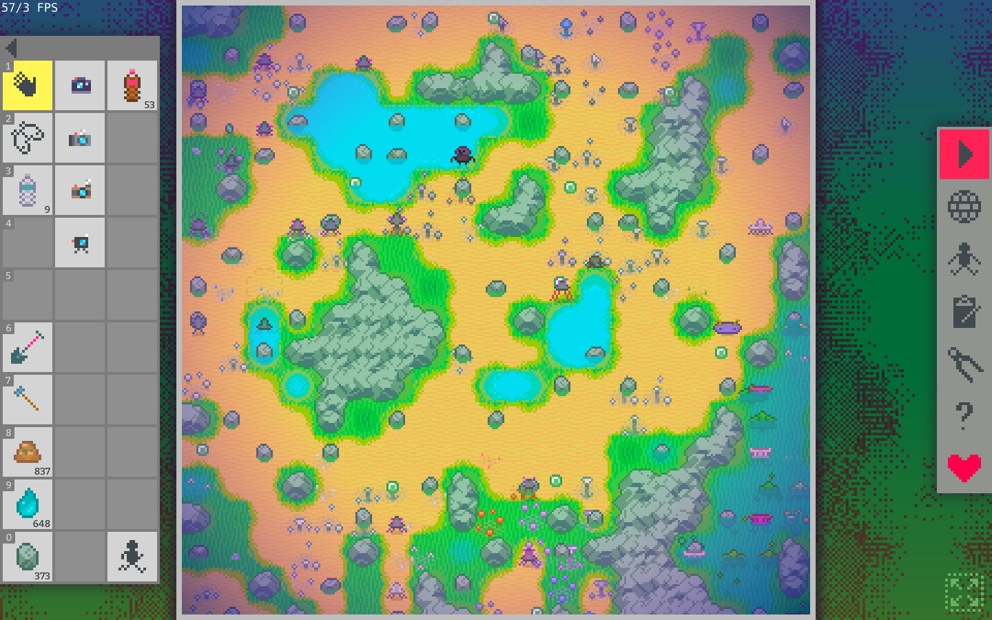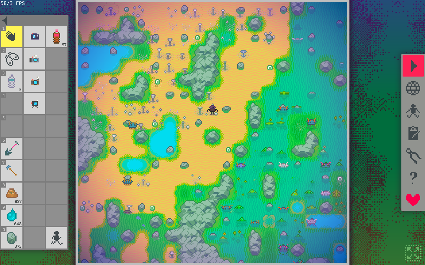 Tile diversity is also quite important; since it’s much easier for anims to adapt to one tile type in particular (e.g. developing a body that barely loses water when standing on that tile), having several they need to live on encourages them to be more hardy, which takes evolutionary resources. However, this usually results in more homogenous body shapes, since the more exotic ones are generally specialized for one tile type.