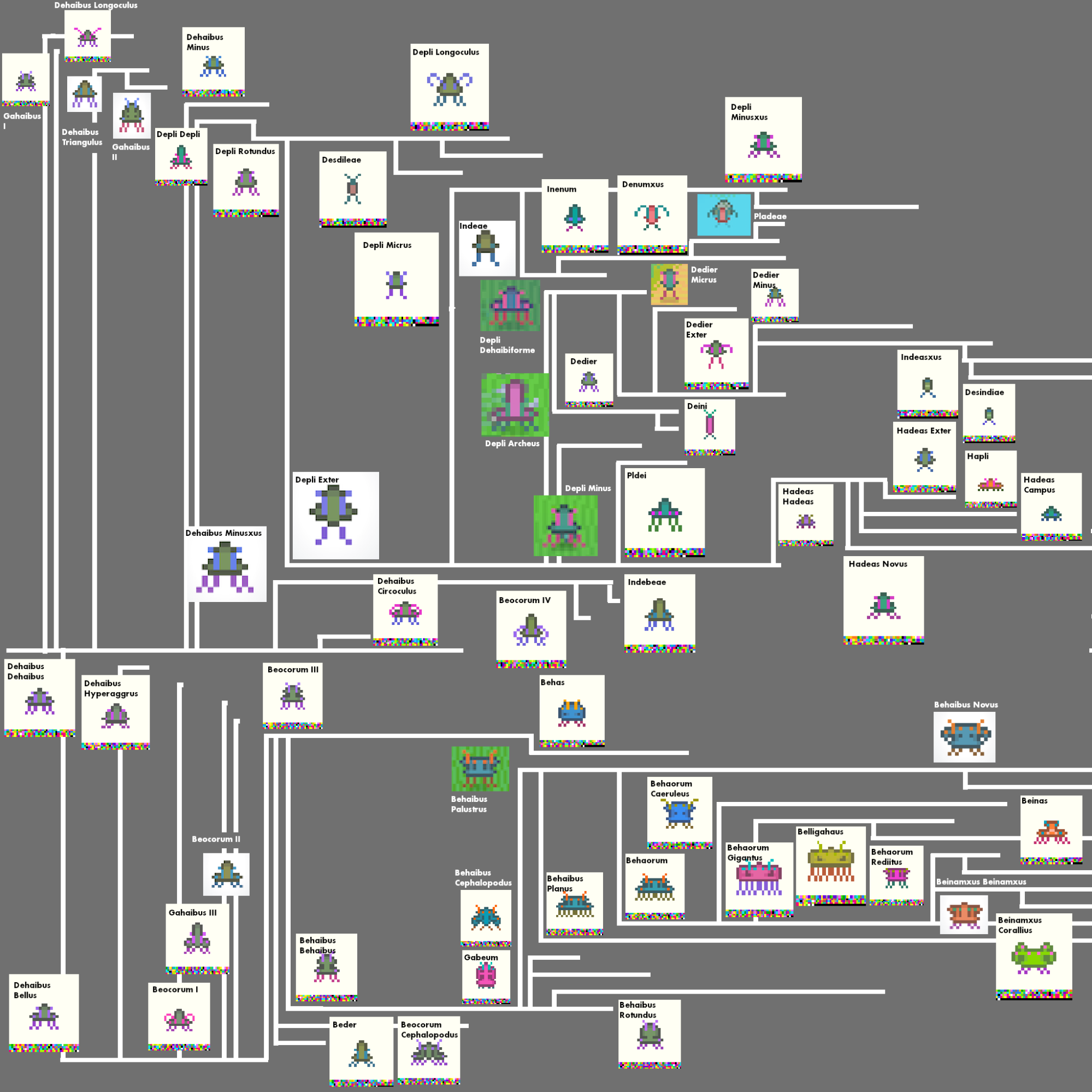 After doing the run, I had the idea of making a phylogeny for Tecoi. Because I wasn’t able to see the whole map all the time during the run (and I’m sometimes missing photographs of certain subspecies), it’s sometimes ambiguous what subspecies was the parent of a new subspecies, and the phylogeny has to make a reasonable guess about it. There’s also a bunch of species I didn’t have enough data on to include! It’s also possible to compare anim DNA to figure out clades, but I’m not experienced with that and haven’t done it here. With practice, it could be possible to take a bunch of extant species in a vacuum and use their DNA to determine information about their common ancestors!