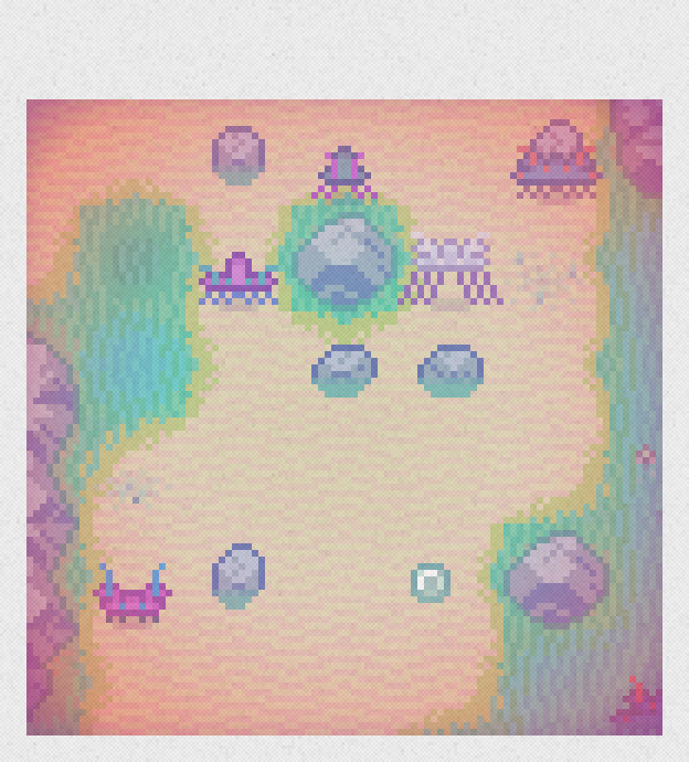 Terraforming the world can be an oddly zen process. I first start by establishing an outline of the key formations— the large rock ranges and the river— and then fill in the tile type of each biome. Then, I begin to flesh out the smaller rock placements, and I start detailing and varying the tiles. Once I’ve done that for everything and the map is in a state I like, I drop rock items EVERYWHERE. From what I can tell, this doesn’t have a noticeable effect on the anims or fungs in the environment, but it significantly improves the aesthetics. A terraformed world is always as much art as it is functional!