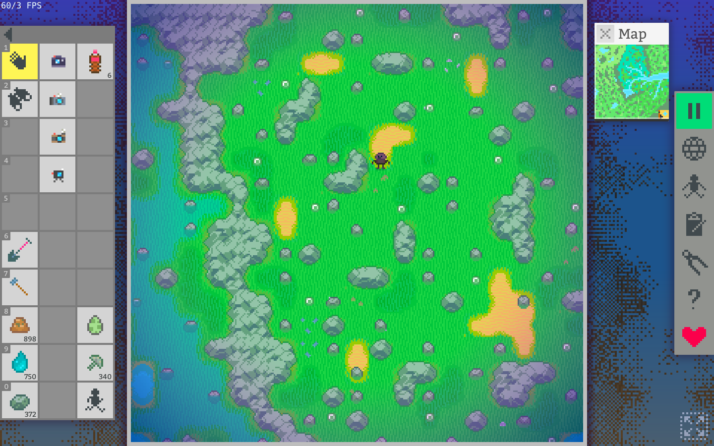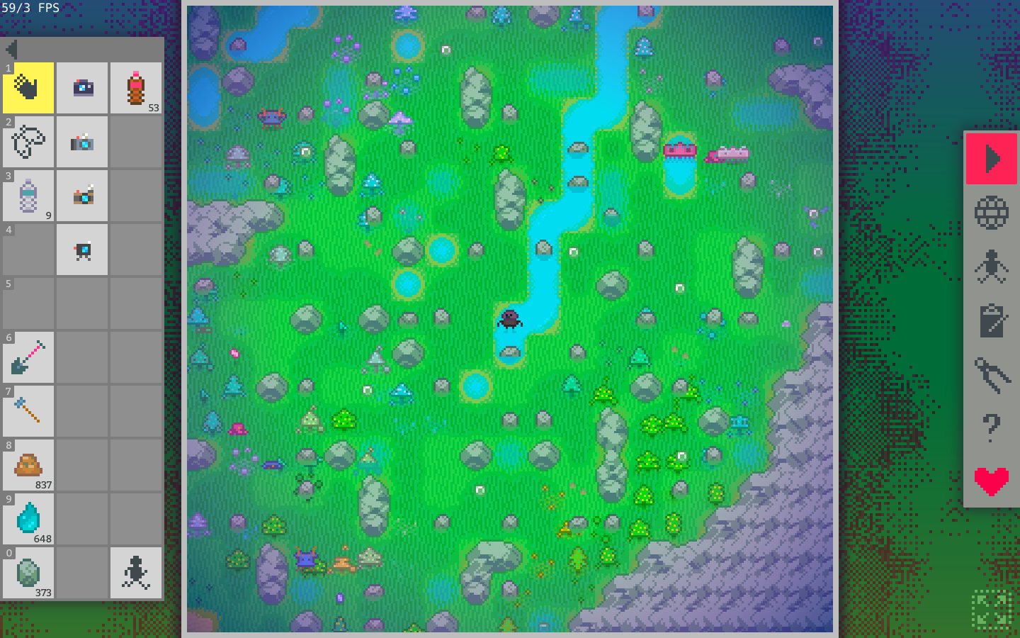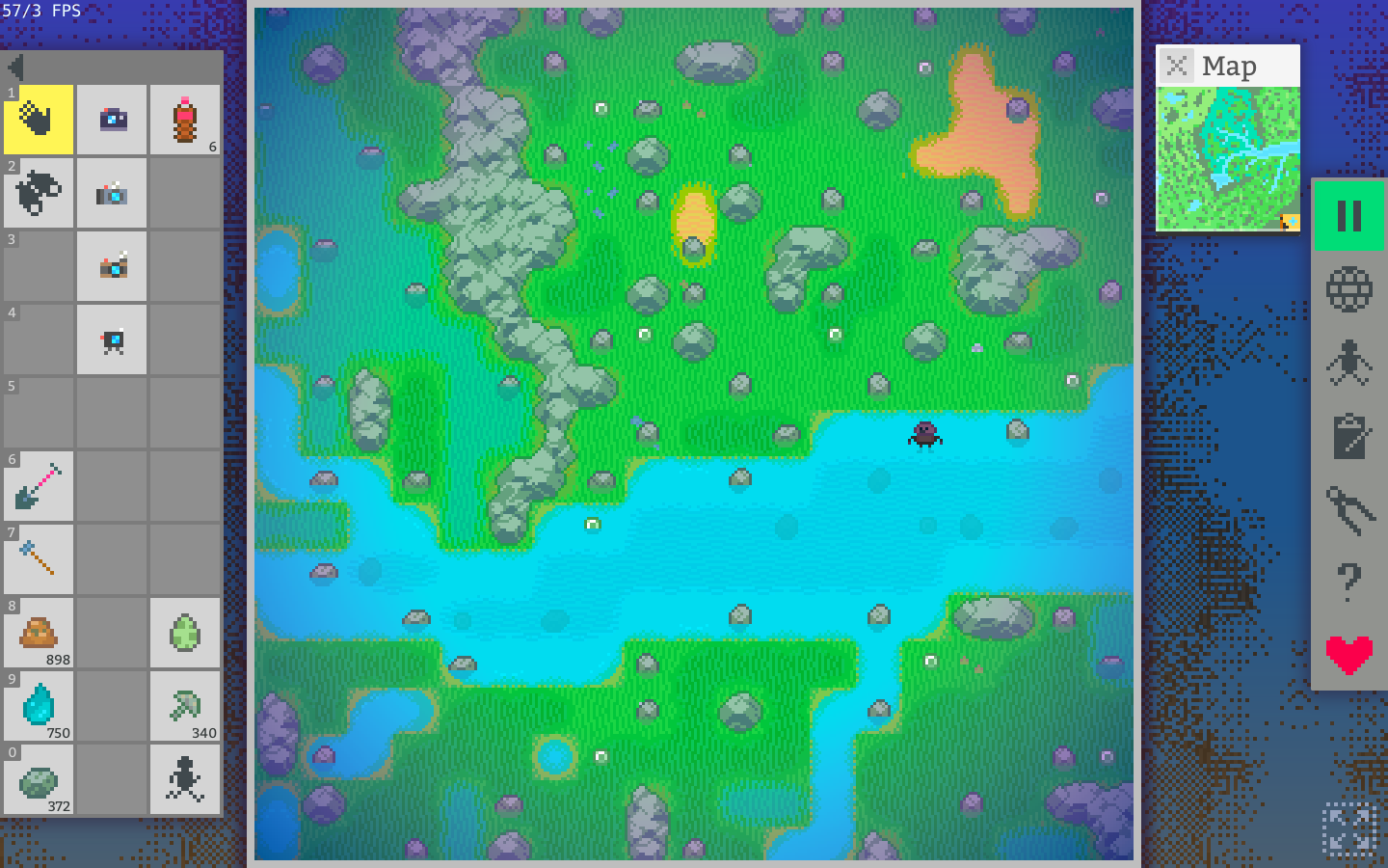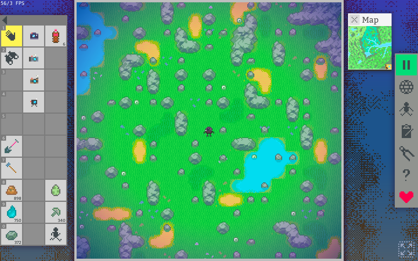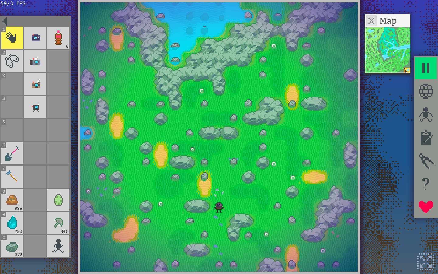 Rocks are one of the biggest parts of the easiness of an environment— through a process I don’t fully understand, blocking anims’ movement consistently lowers the population density of an environment. Doing this also makes it more difficult for anims to maneuver towards food or water, usually causing them to develop better sensory perception.