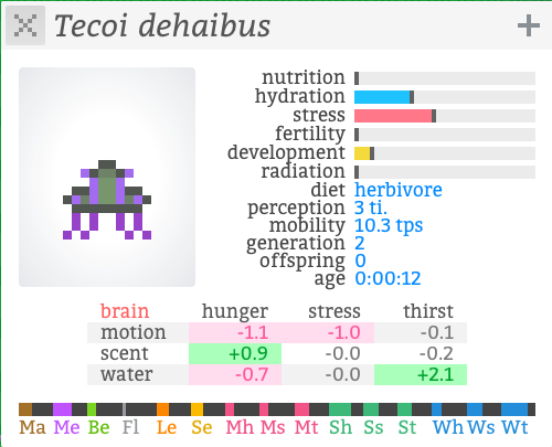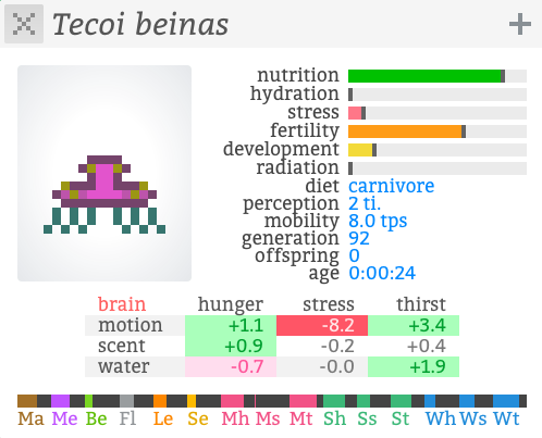 The anim lifecycle mimics that of animals in real life. Anims have four key stats: hunger, thirst/overhydration, stress, and fertility. Hunger gradually decreases over time, and can be refilled if an anim eats the fung on the same tile as it. Thirst will either increase or decrease depending on the tile the anim’s on and its flesh/skin ratio; usually it gradually decreases, an anims will have to take a drink in a marsh or water tile to refill it. When the hunger or thirst bars are empty, or the anim has gained too much water (through having a low flesh/skin ratio and standing on a wet tile; drinking will never overfill the bar), its stress will go up; if the stress bar fills completely, the anim will die. The stress bar drains when neither the hunger nor the thirst bar are empty. The fertility bar also fills under these conditions, and drains when the stress bar is not empty. If the fertility bar fills completely, it will get emptied, the stress bar will increase by half, and the anim will lay an egg (which will hatch into a copy of the parent, but whose DNA might be slightly mutated; all anims reproduce asexually). There’s also a fifth stat, development, but all it does is track the anim’s lifespan (and can’t be affected by other things). When it fills completely, the anim dies.