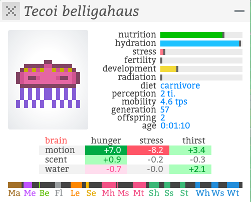 And of course, the vicious Dehaibus Hyperaggrus lineage. With a defining mutation in Motho that turns it into a killing machine when thirsty, these anims will typically reproduce once before going nuts, hunting down other anims, and eventually dying of thirst.
