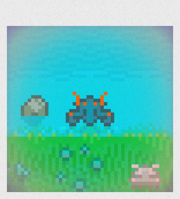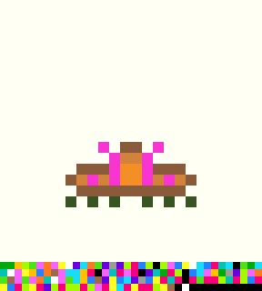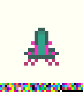 Three of these control the bending of the anims’ three bones, which determine its body shape in a very simple way. All anims fit within 16x16 pixels, and have bilateral symmetry; thus, the bones are mirrored on both sides. The bones can overlap. An anim’s body is procedurally built around the bones: “flesh” is placed on pixels occupied by bones, while “skin” is placed on adjacent pixels. The amount of flesh on an anim determines how much stress it can take before dying (consider the vitality of an elephant that’s hungry or wounded versus a mouse), and the ratio of skin to flesh determines how fast the anim loses water. This last bit is probably the most relevant piece of the anim’s physiology, since it makes or breaks its ability to survive in an environment. Smaller anims that don’t lose water fast will drown in wetter environments, while wrinkly anims with lots of skin will quickly die of thirst in dry ones if they can’t find water to drink from.