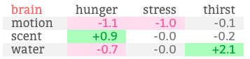This chart, available for every anim, shows these relations. If, for example, this anim is hungry, not stressed, and not thirsty, then it will avoid motion and water and be attracted to fungs. If it then becomes thirsty, it will be very attracted to water, likely overpowering its other stimuli.