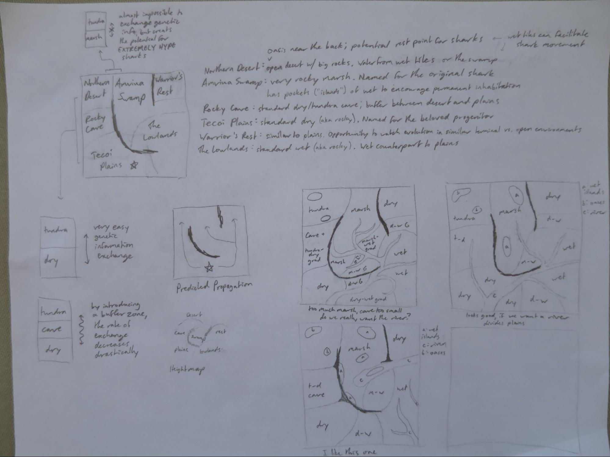 Every map starts with a rough idea of goals or a particularly interesting formation I’d like to explore, and this one was no different. I opted for a more open layout to allow for large environments, which I hoped would make the world a bit more exciting than more cramped maps; large environments allow several species to coexist and significantly decrease the risk of extinction events. I included two special features in addition to basic biomes: a desert/marsh boundary and a pair of near-identical but separated environments.