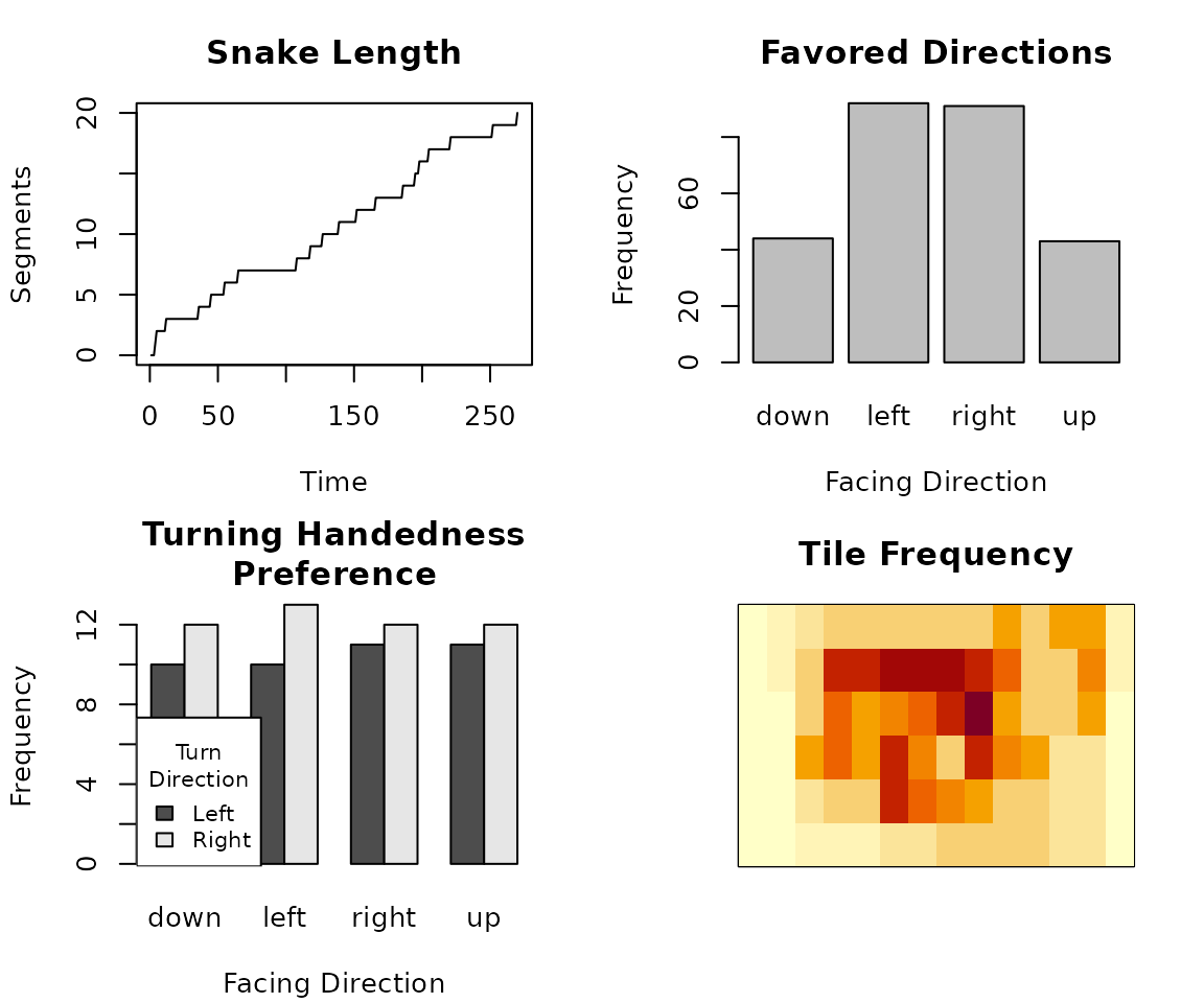Plot 4 (“Tile Frequency”) displays a heatmap of how frequently the snake head was on each tile. Unsurprisingly, it’s grouped towards the middle; I didn’t get far enough in this game to have to start hugging the sides.